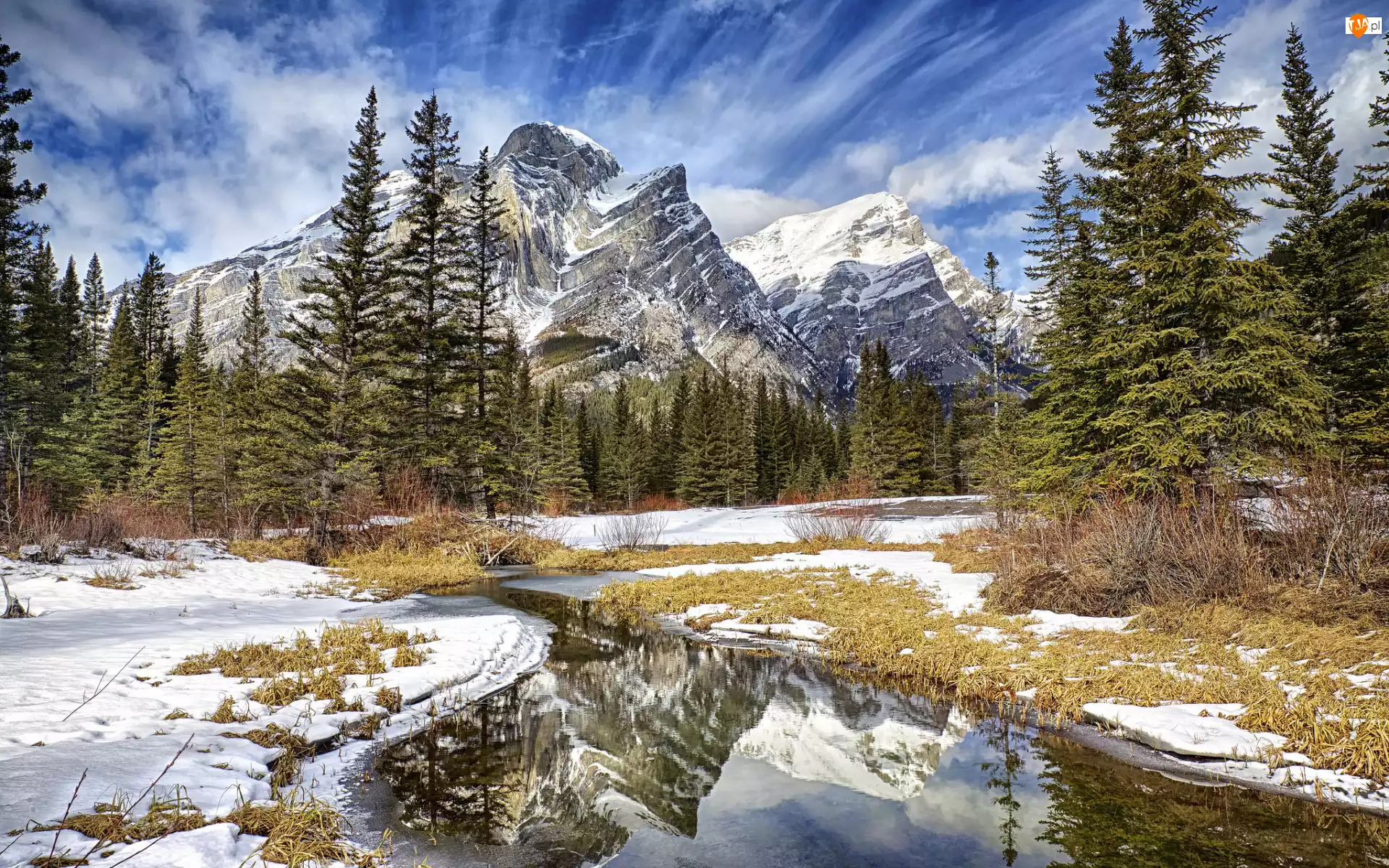 Kanada, Śnieg, Roztopy, Drzewa, Góry, Zima, Góra, Canadian Rockies, Mount Kidd, Alberta