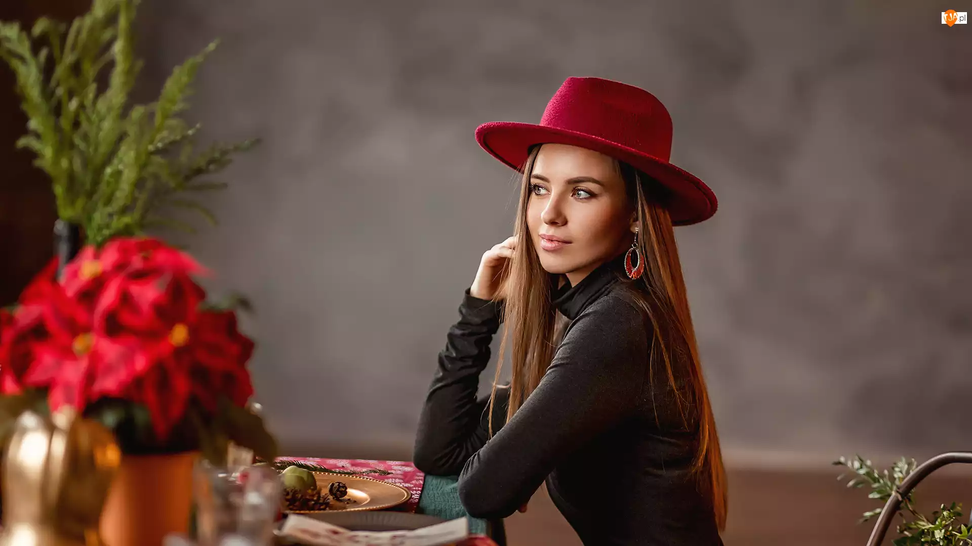 Kapelusz, Długowłosa, Kobieta, Czerwony