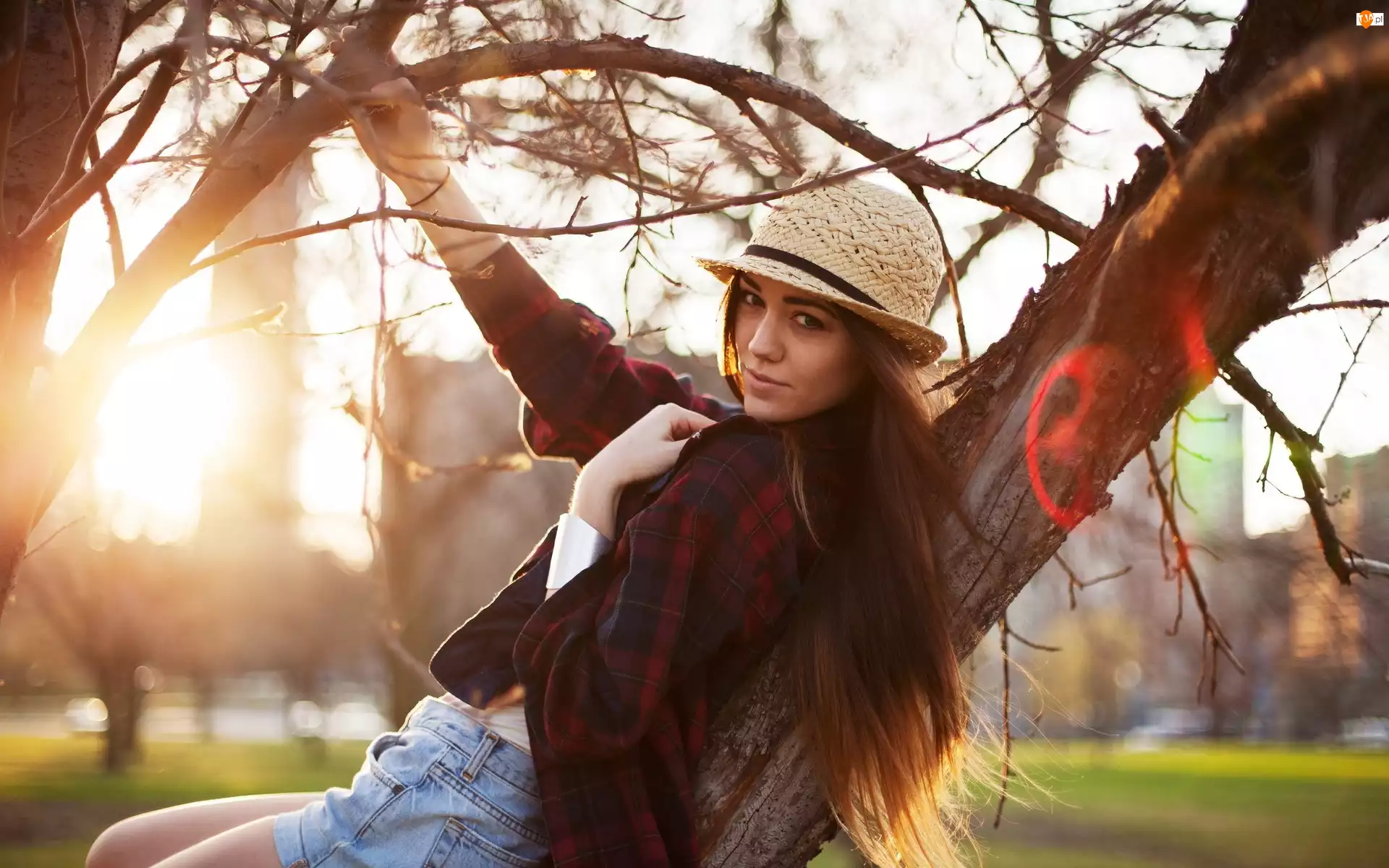 Kapelusz, Przebijające, Pochylona, Słońce, Kobieta, Drzewo