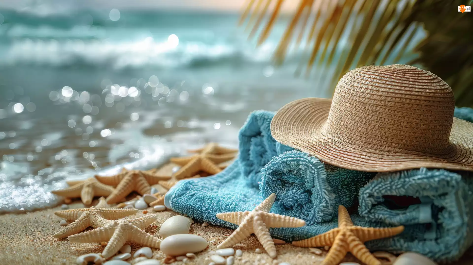 Kapelusz, Ręcznik, Kompozycja, Plaża, Morze, Muszelki, Rozgwiazdy