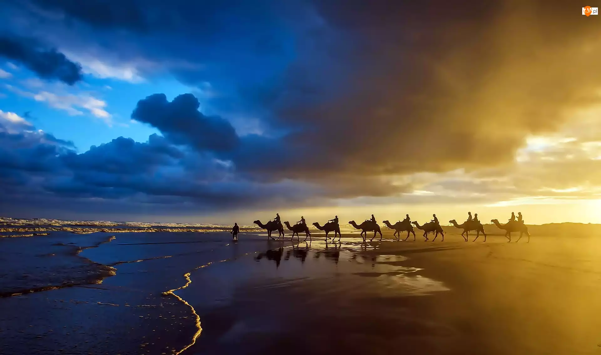 Karawana, Słońca, Morze, Chmury, Brzeg, Zachód