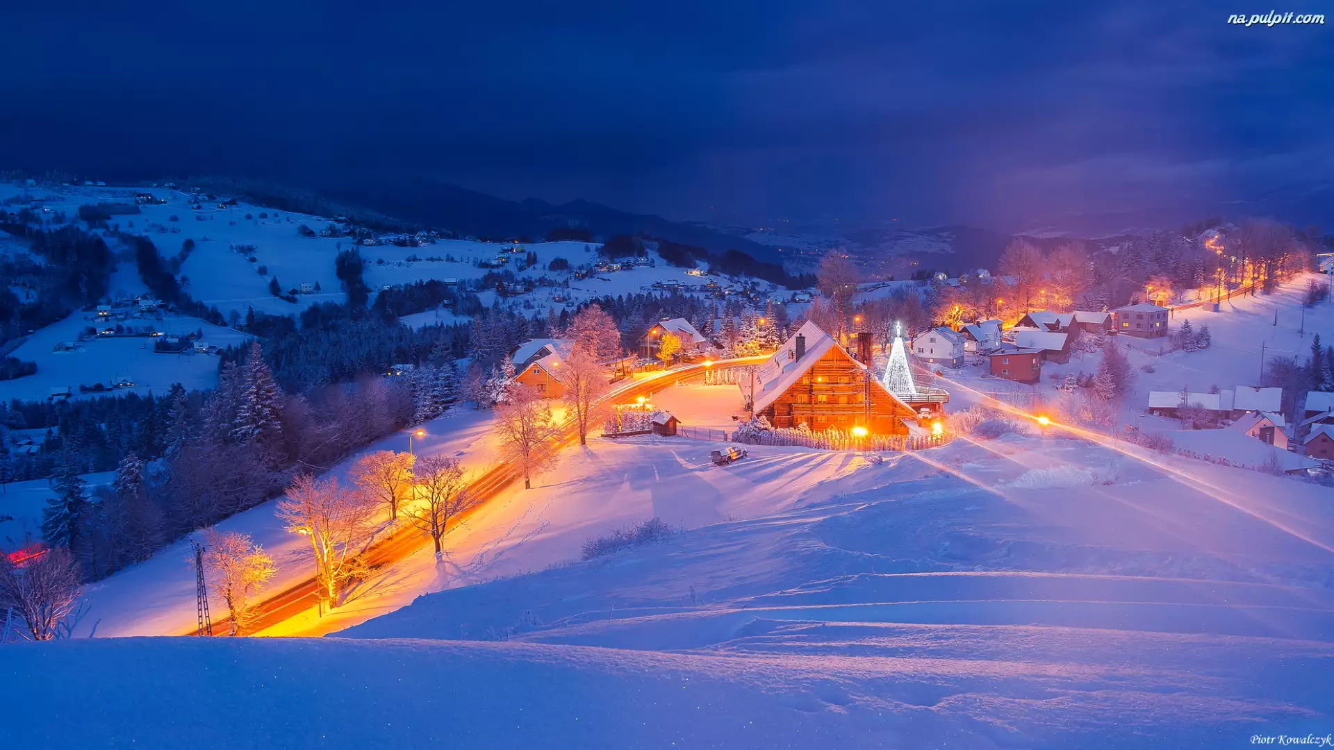 Polska, Karczma Ochodzita, Koniaków, Dom, Oświetlona, Zima, Góry, Droga, Beskid Śląski, Gmina Istebna