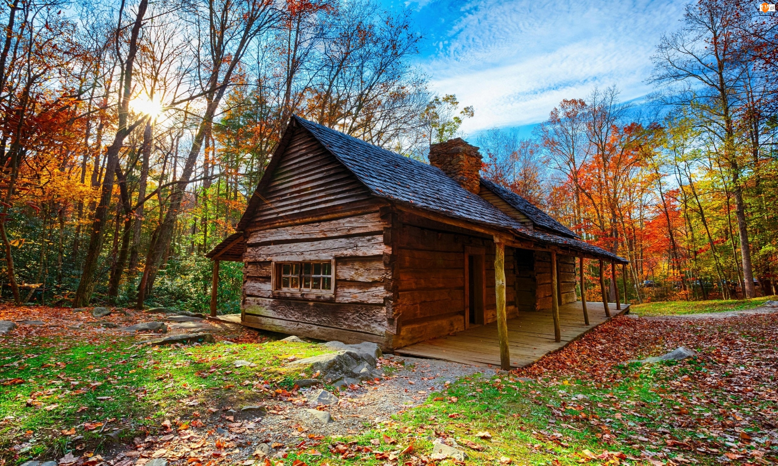 Karolina Północna, Słońca, USA, Drzewa, Promienie, Park Narodowy Great Smoky Mountains, Jesień, Dom, Liście
