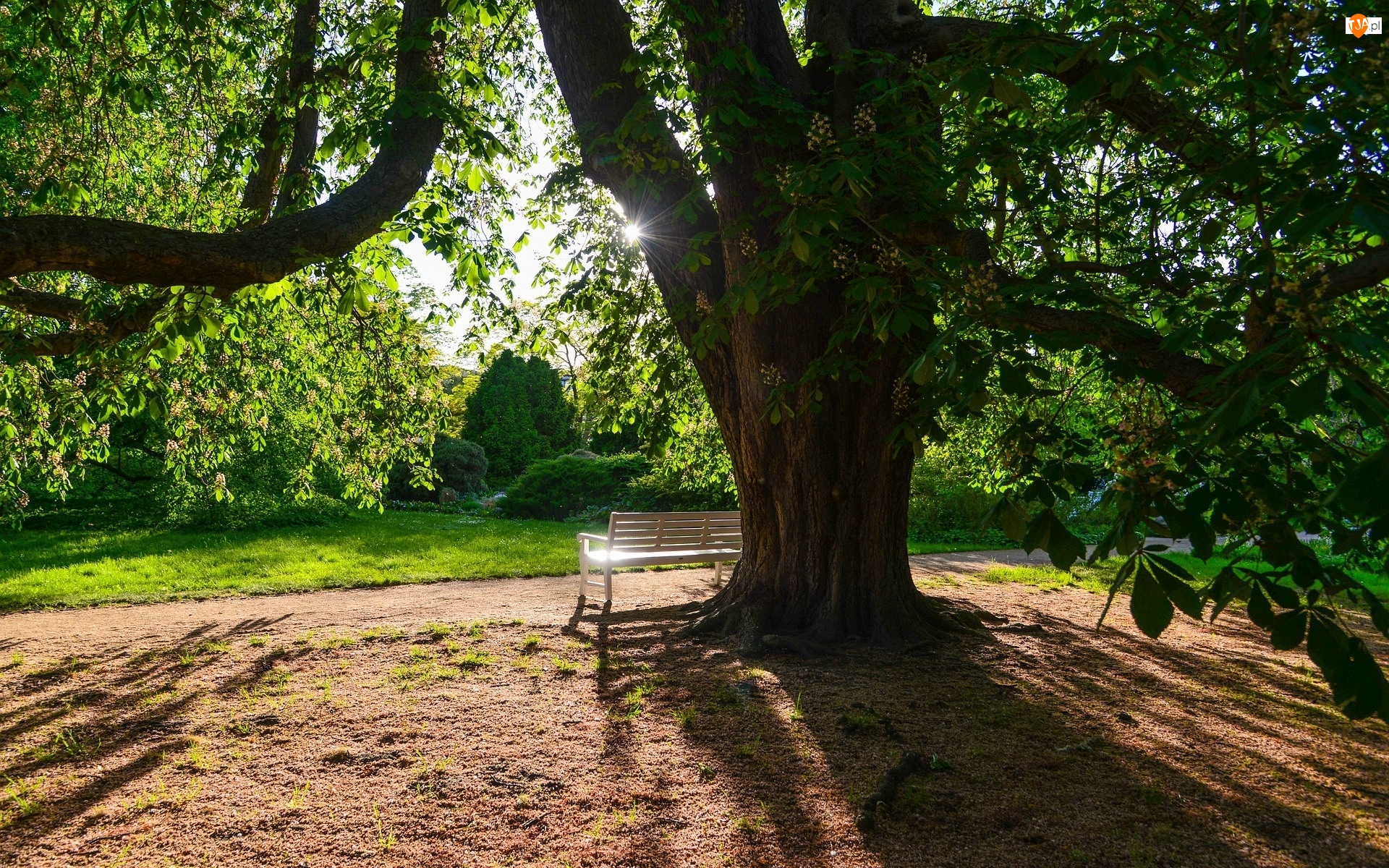 Kasztanowiec, Drzewo, Ławka, Promienie słońca,
