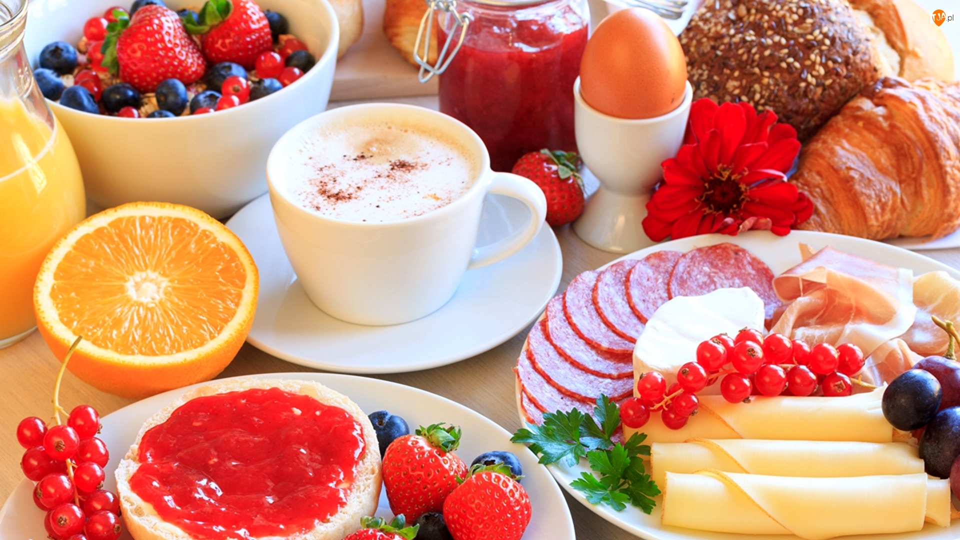 Talerze, Dżem, Sok, Jajko, Kawa, Śniadanie, Wędlina, Ser, Owoce, Pieczywo