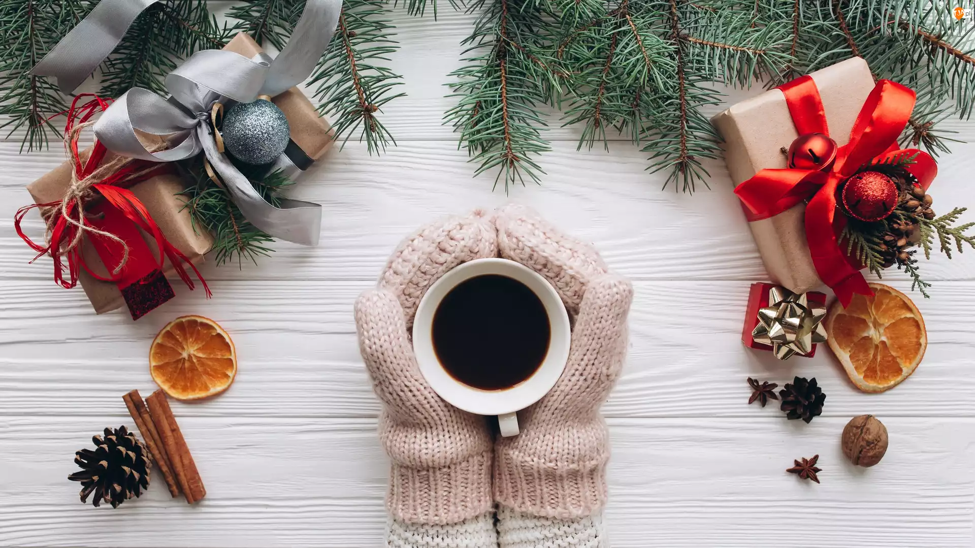 Dłonie, Kawa, Świąteczne, Gałązki, Rękawiczki, Prezenty