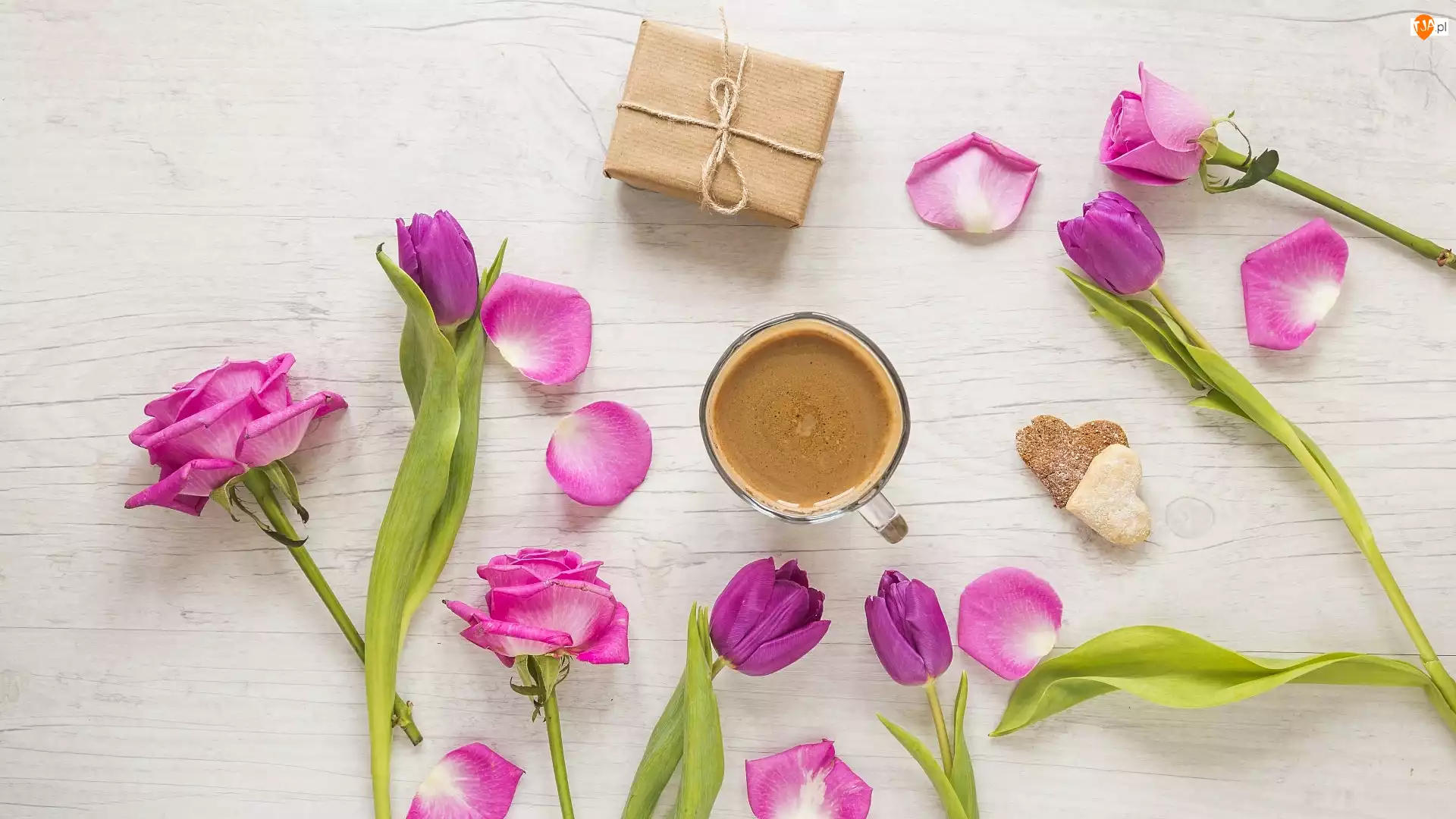 Kawa z ciasteczkami tulipanami i prezentem