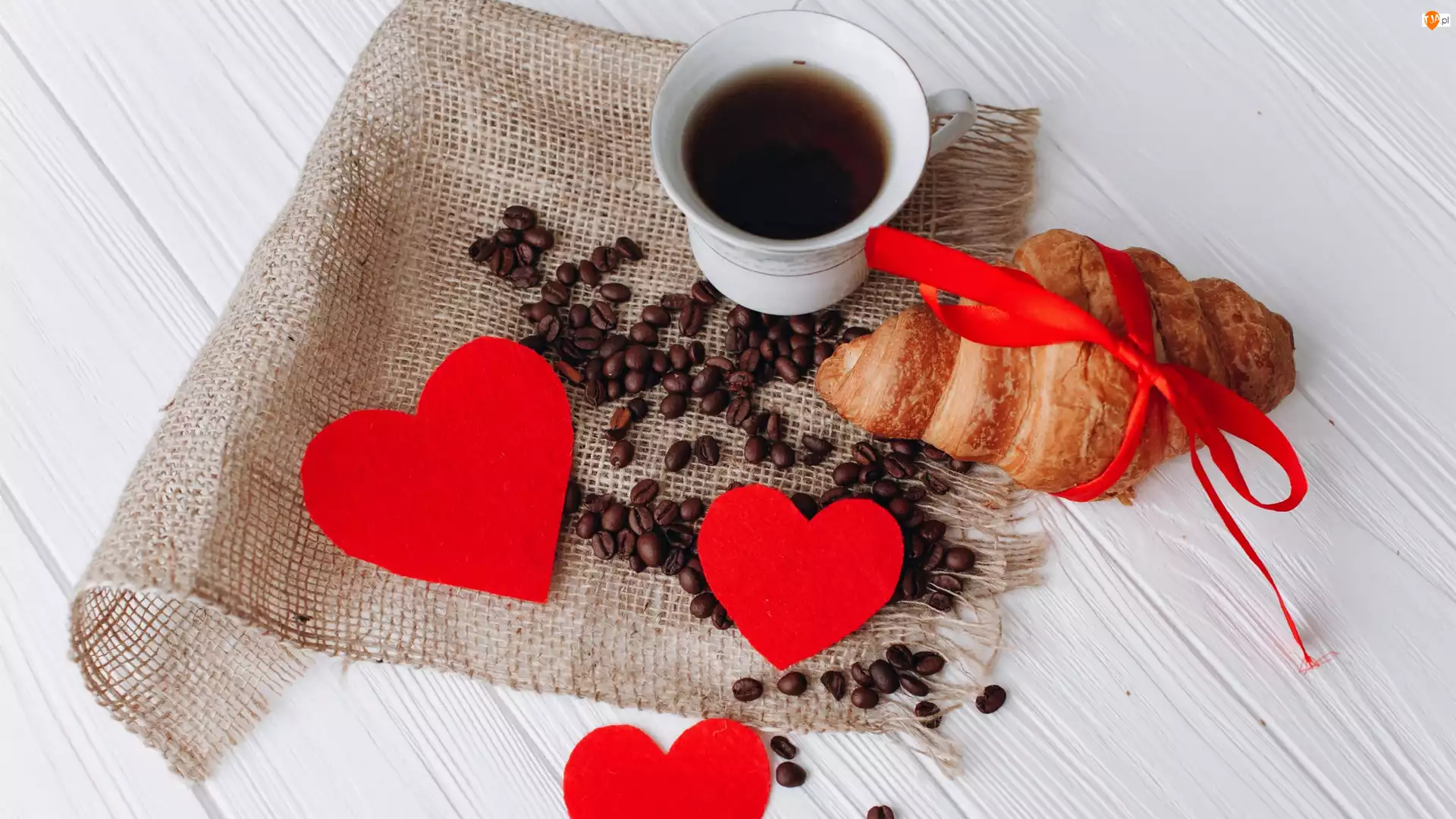 Kawa z ziarnami sercami i rogalikiem
