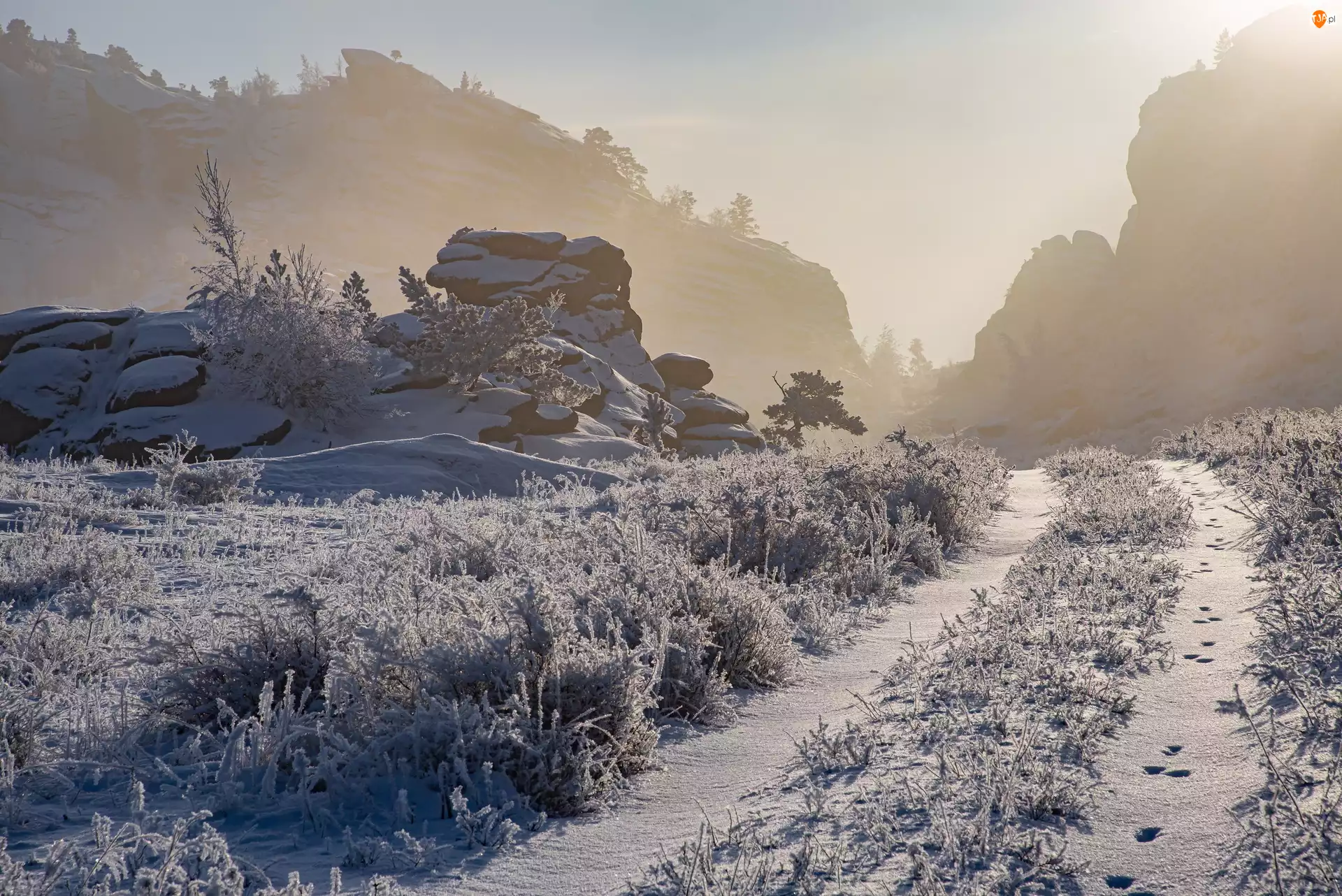 Kazachstan, Skały, Prowincja Pawłodar, Rośliny, Park Narodowy Bayanaul, Droga, Mgła, Zima, Oszronione