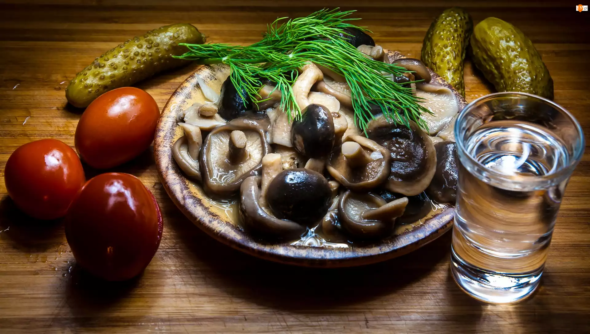 Grzyby, Talerz, Szklanka, Marynowane, Ogórki, Pomidory, Koperek