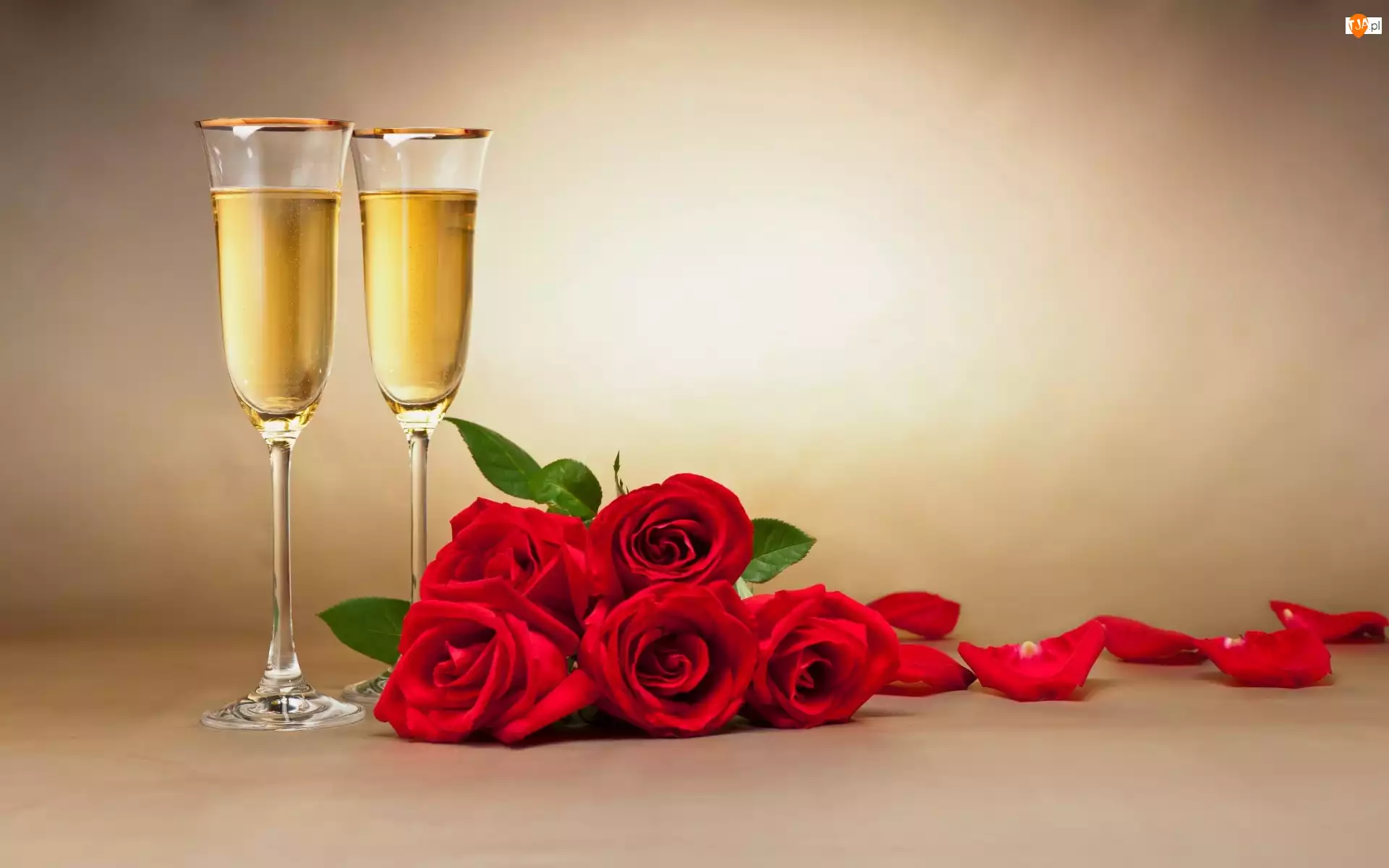 Urodziny, Walentynki, Szampan, Róże, Kieliszki, Czerwone