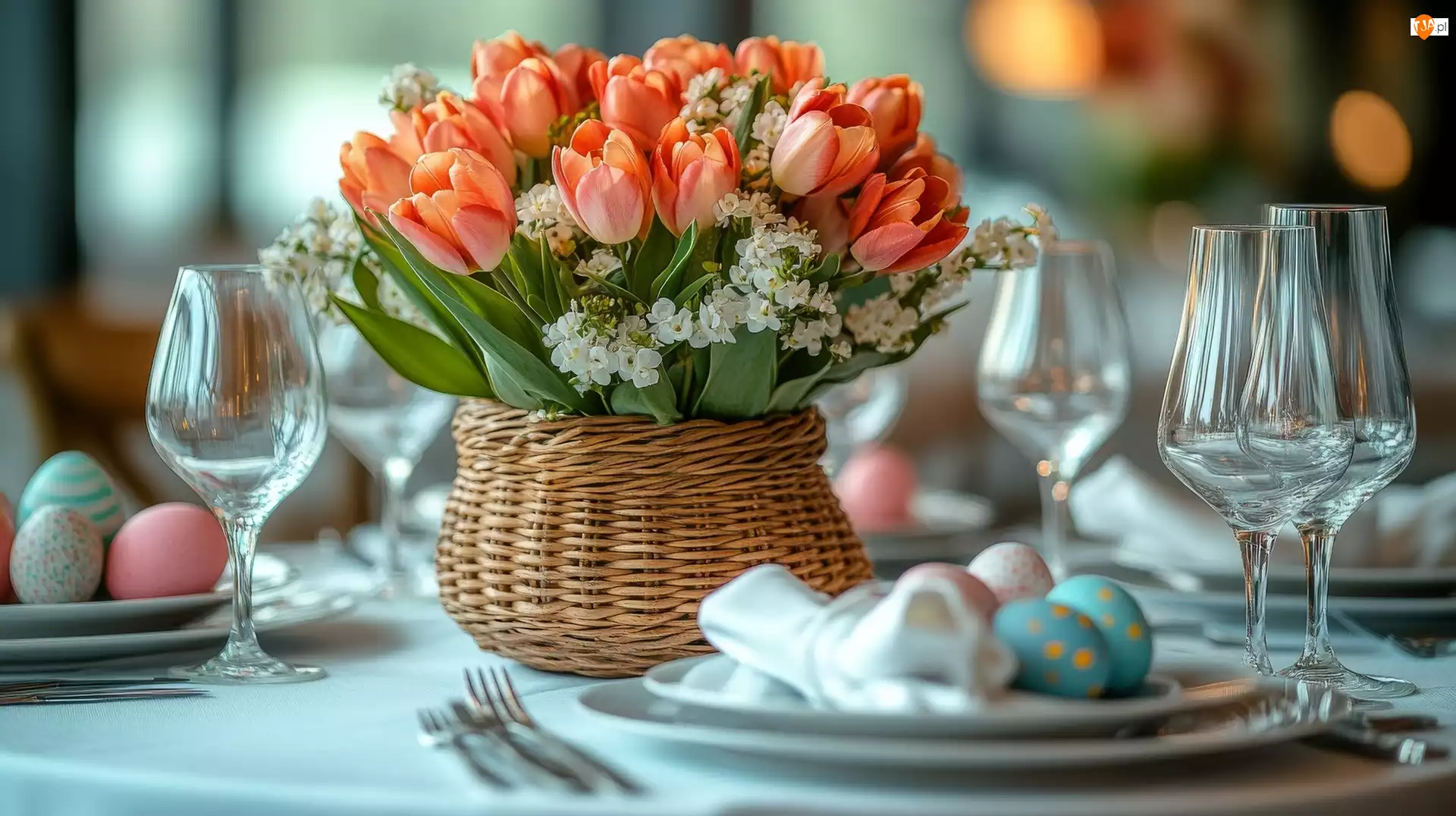 Kieliszki, Stół, Talerze, Koszyczek, Pisanki, Wielkanocny, Bukiet, Wielkanoc, Tulipany