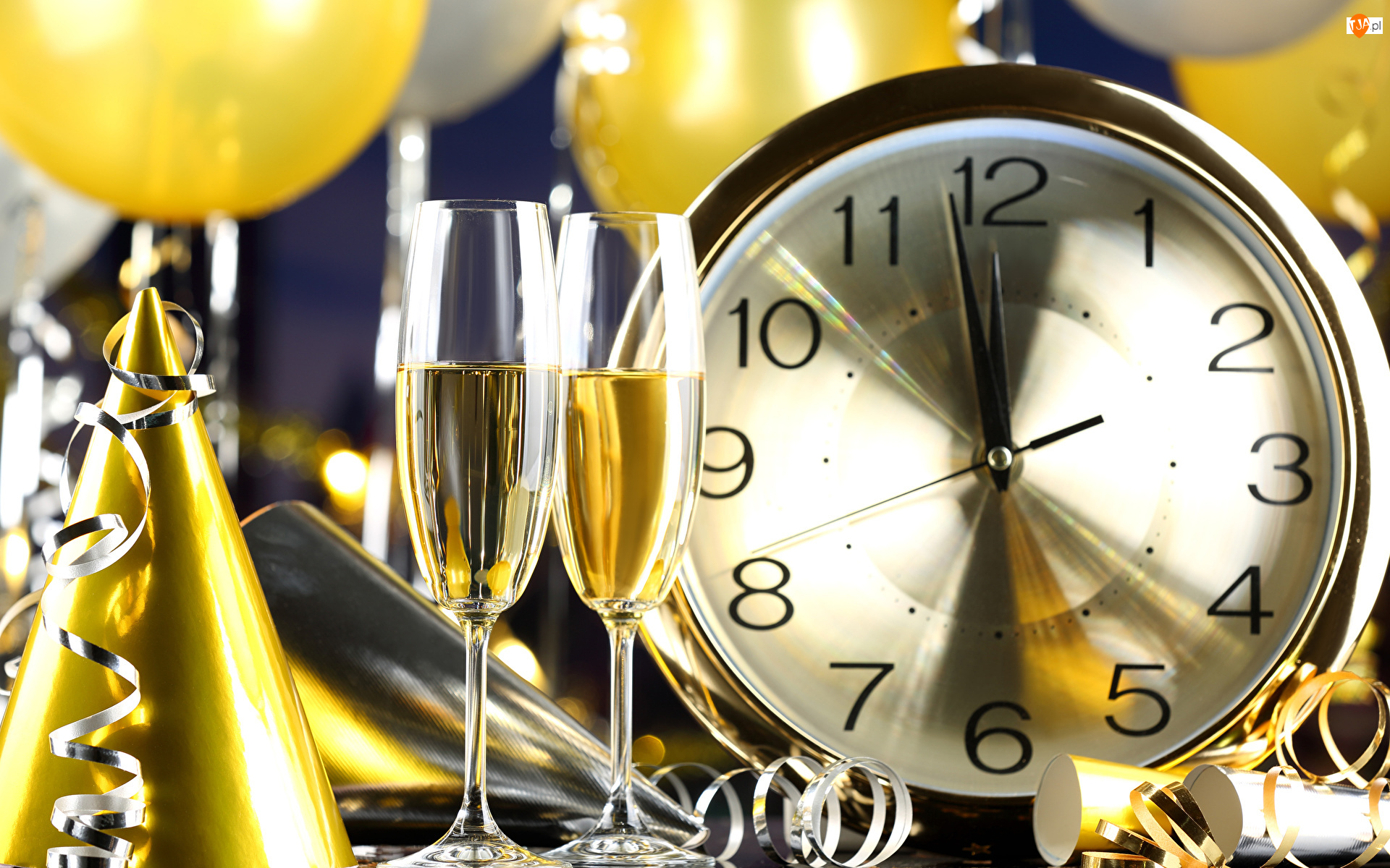 Kieliszki, Zegar, Serpentyna, Sylwester, Szampan, Balony