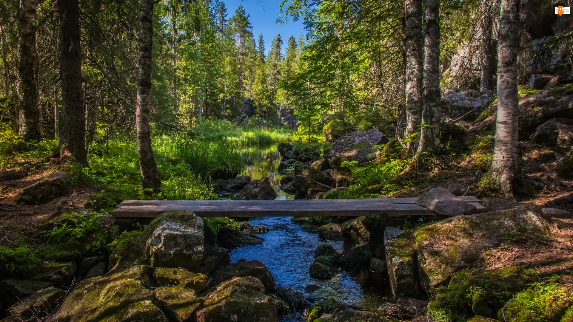 Drzewa, Las, Kamienie, Kładka, Potok, Skały