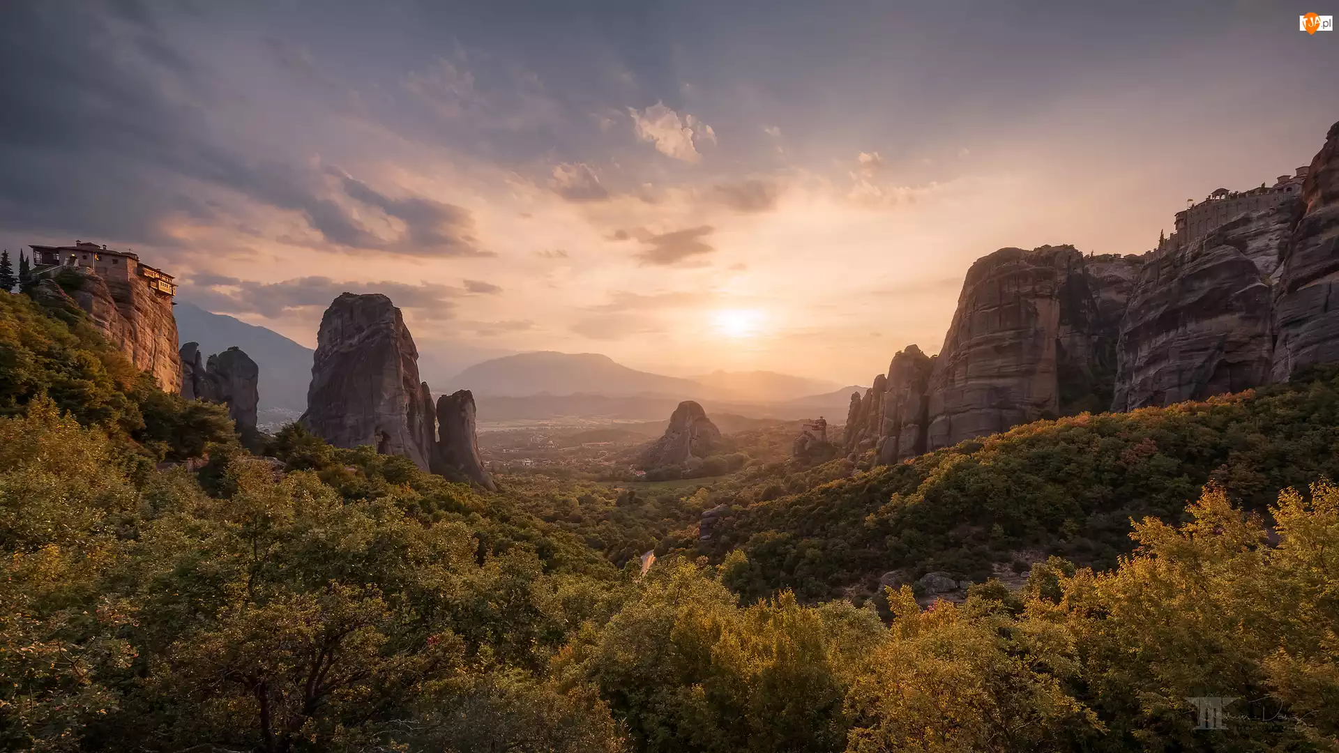 Masyw Meteory, Skały, Drzewa, Grecja, Klasztory, Równina tesalska, Tesalia