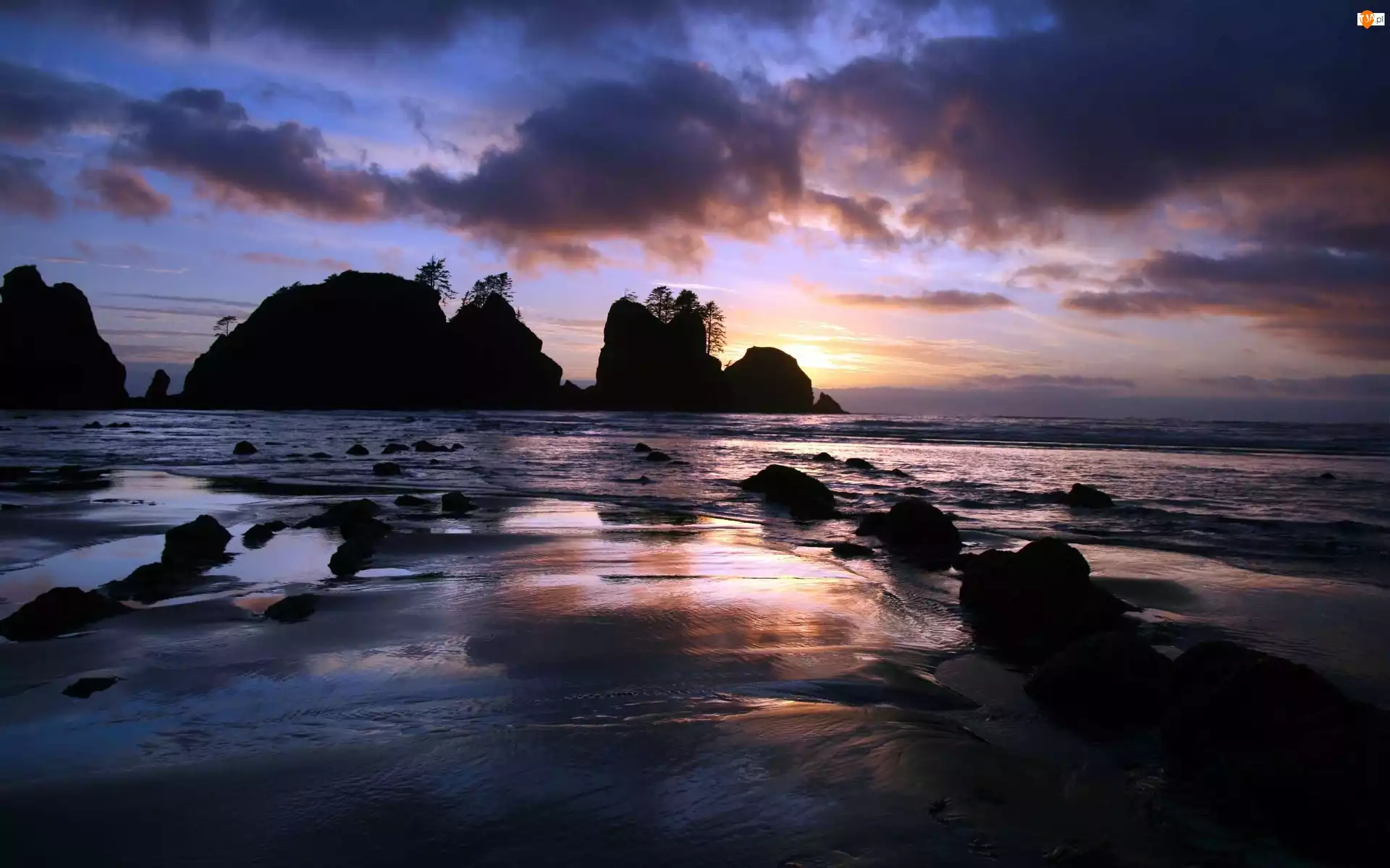 Klify, Zachodzące, Morze, Słońce, Plaża, Chmury
