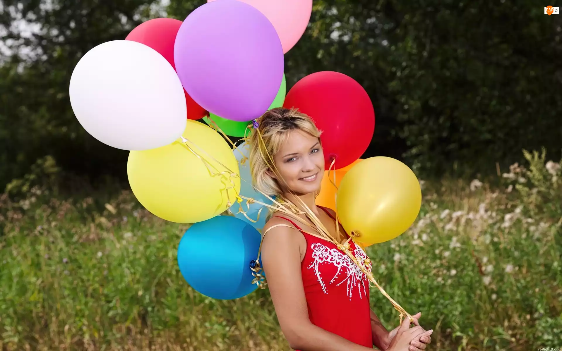 Kobieta, Balony, Uśmiechnięta, Trawy, Blondynka,
