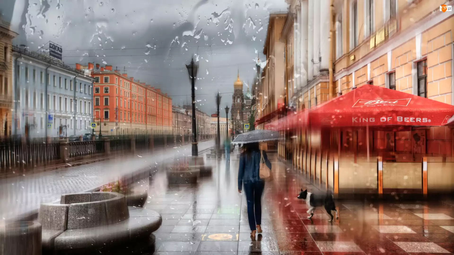 Budynki, Parasol, Deszcz, Pies, Ulica, Kobieta