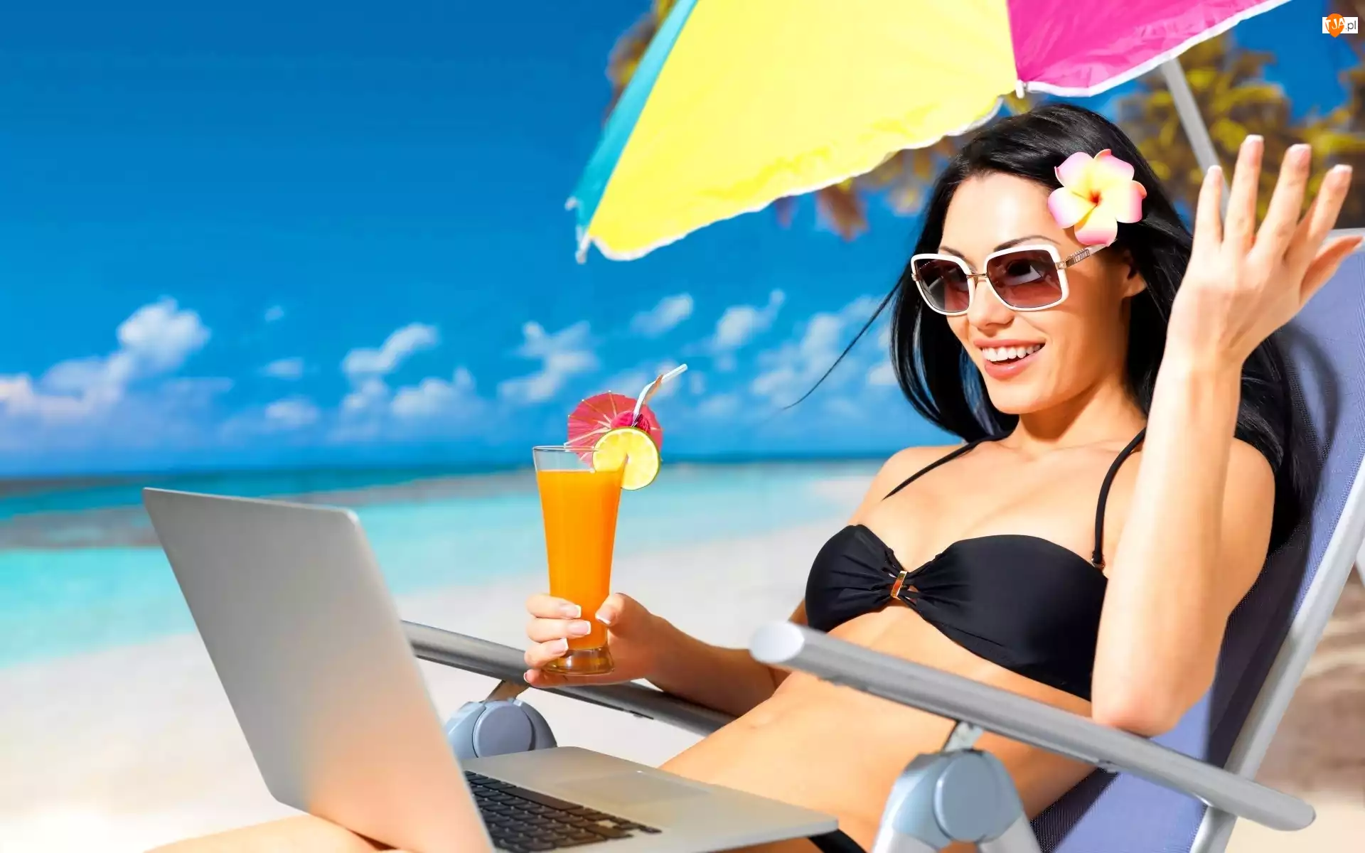 Kobieta, Drink, Morze, Laptop, Plaża, Okulary