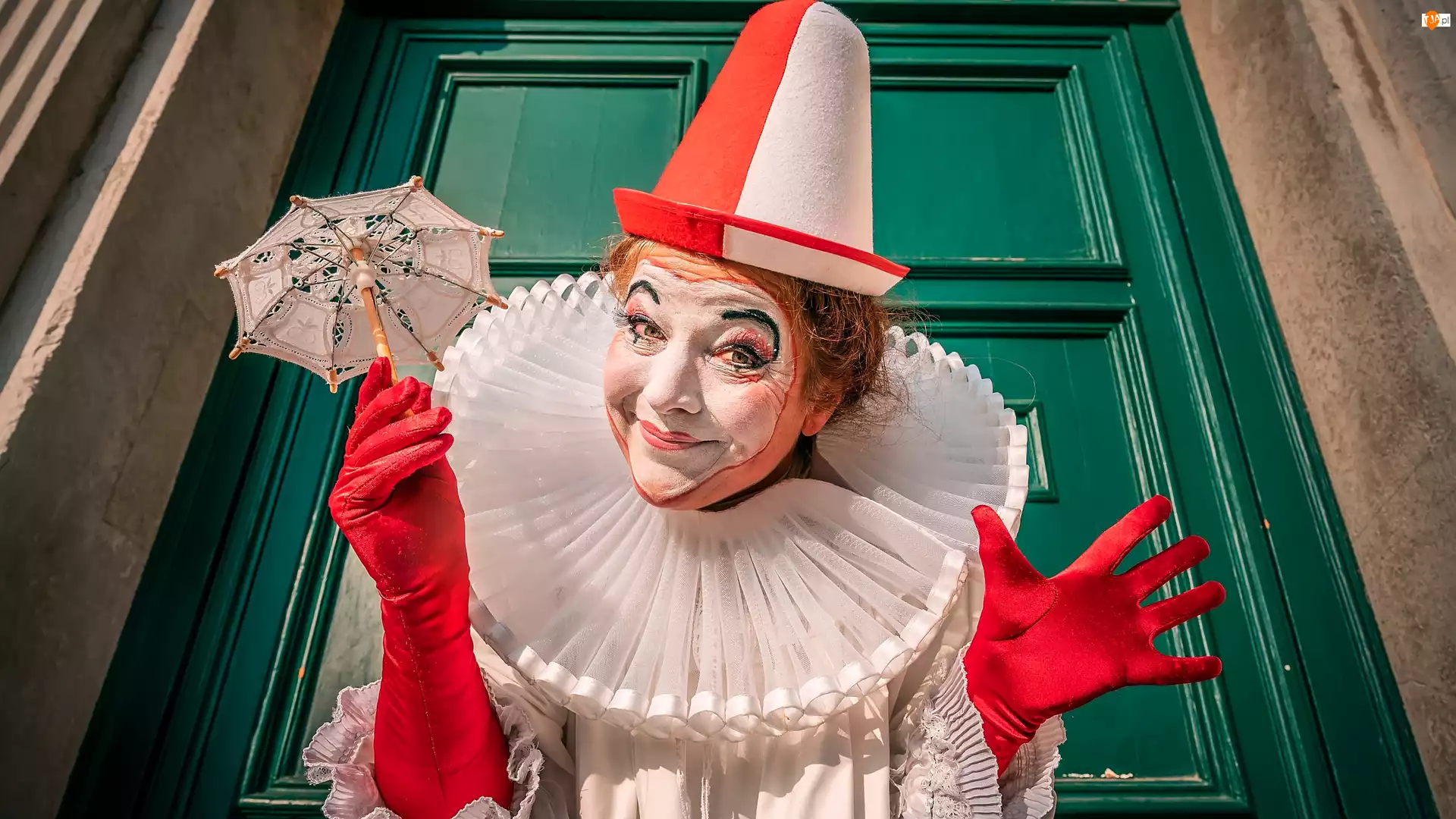 Czapka, Uśmiechnięty, Czerwone, Zielone, Klaun, Rękawiczki, Drzwi, Parasolka