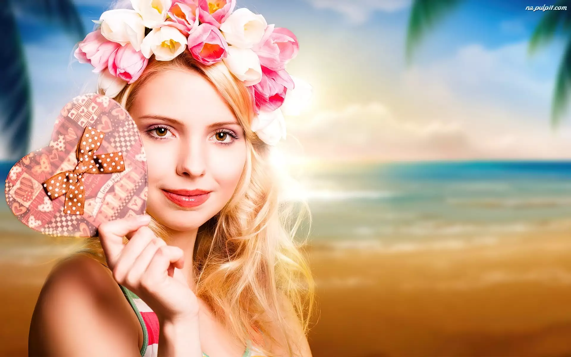 Kobieta, Kwiaty, Morze, Serce, Brzeg, Wianek
