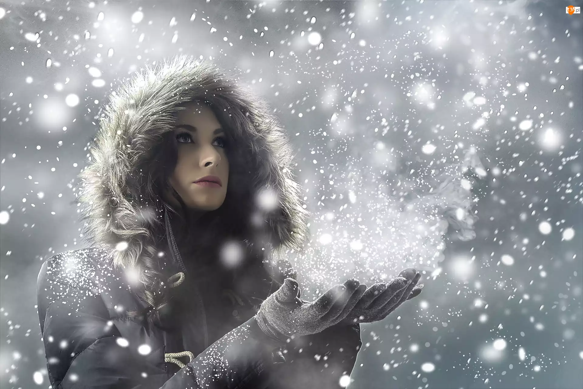 Dłonie, Kobieta, Płatki, Zimowe, Śniegu