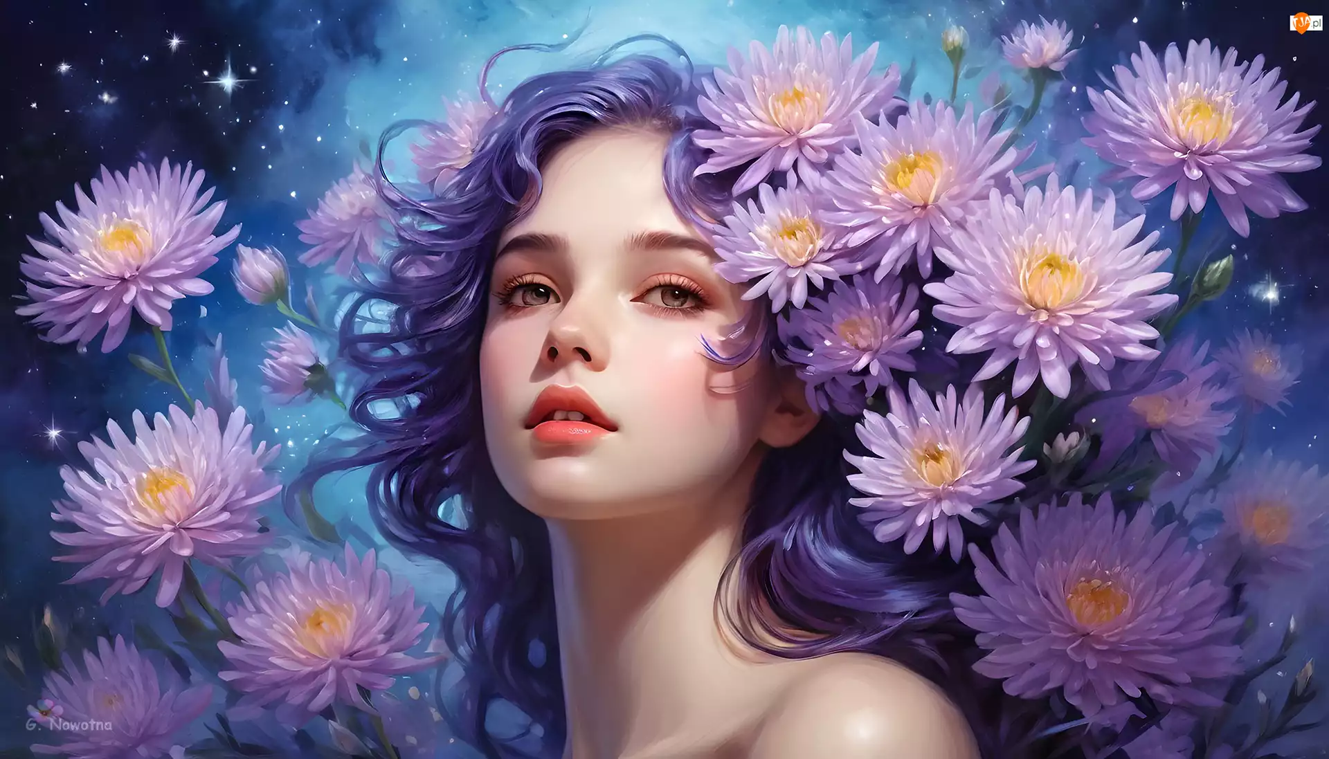 Kobieta, Młoda, Jasnofioletowe, Grafika AI, Kwiaty, Astry