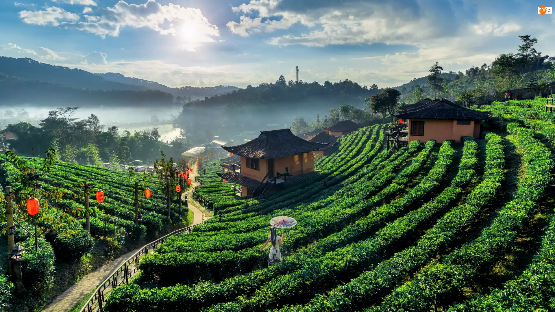 Tajlandia, Wioska, Ban Rak Thai, Parasolka, Herbaty, Plantacja, Domy, Ścieżka, Kobieta, Prowincja Mae Hong Son