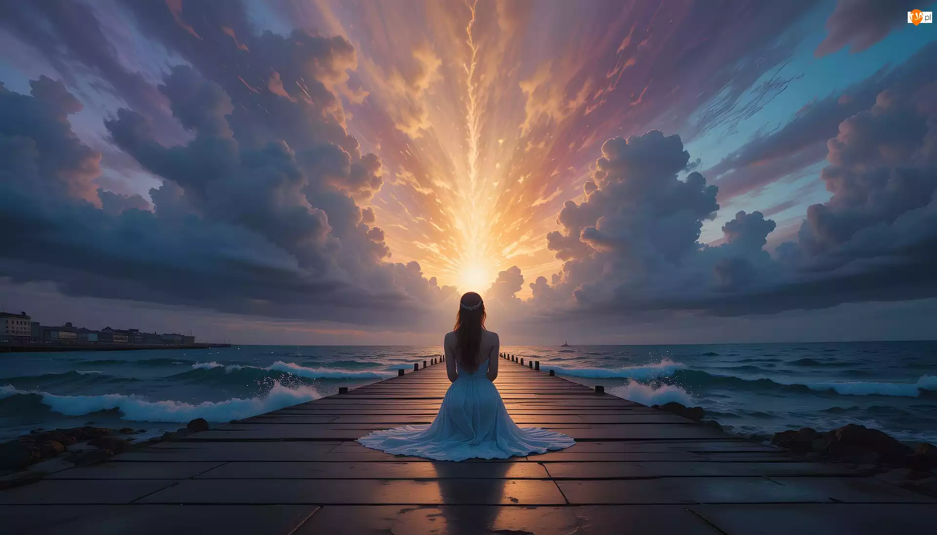 Morze, Kobieta, Zachód słońca, Grafika, Pomost, Chmury