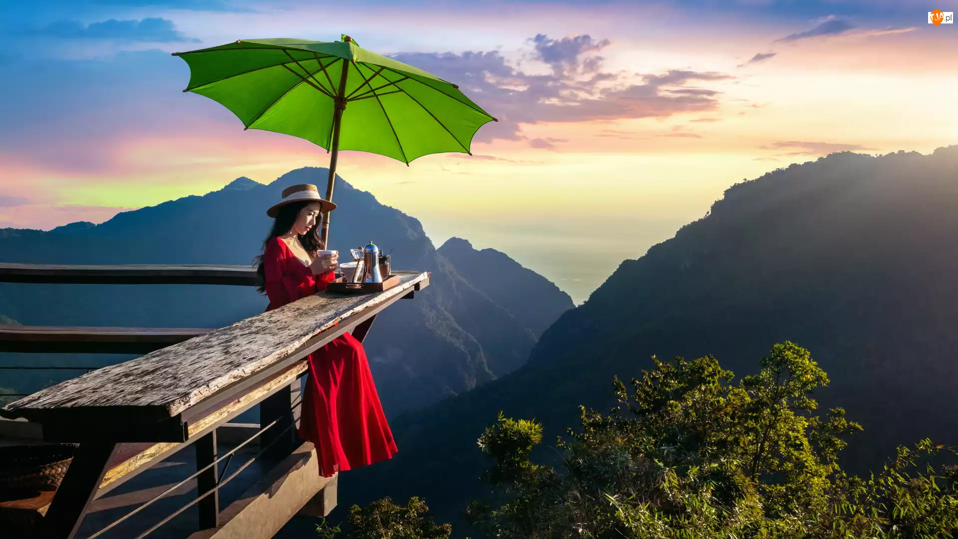 Tajlandia, Parasolka, Pha Hi Village, Zielona, Taras widokowy, Góry, Czerwona, Kobieta, Suknia, Prowincja Chiang Rai