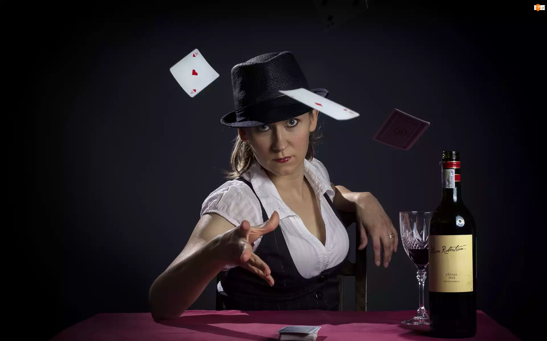 Karty, Wino, Kobieta, Stół, Krupier, Kieliszek