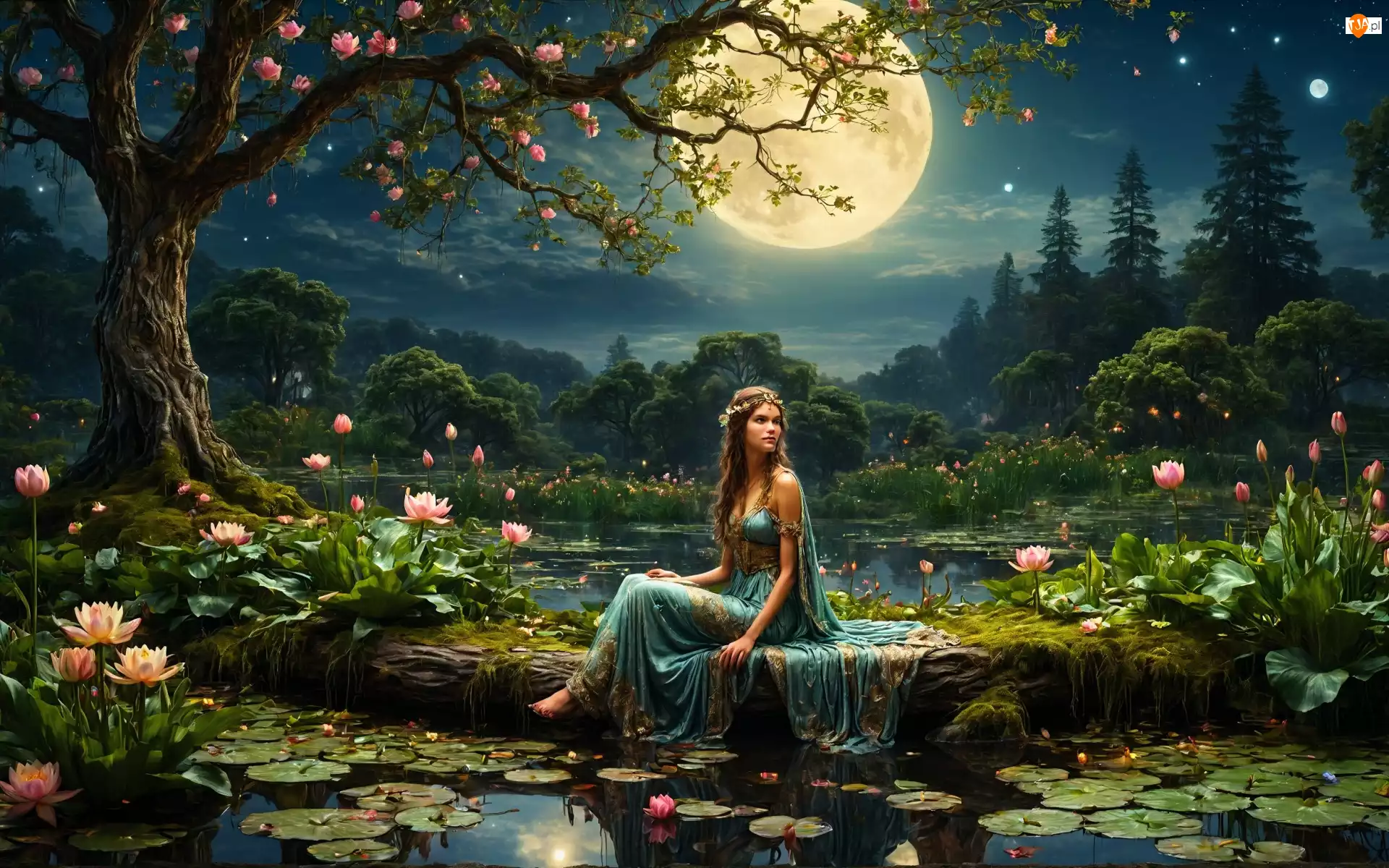 Staw, Kobieta, Drzewo, Grafika, Lilie wodne, Księżyc