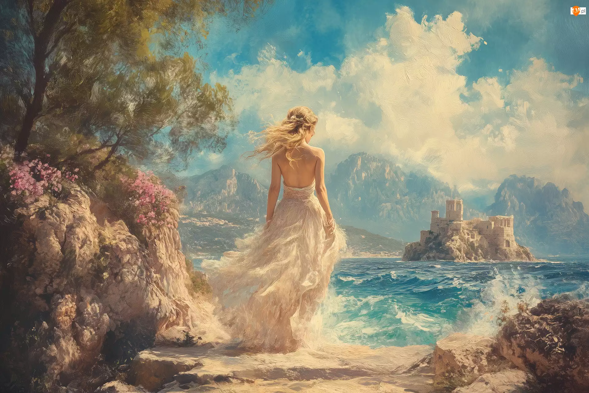 Wyspa, Kobieta, Skały, Zamek, Biała, Morze, Grafika, Suknia
