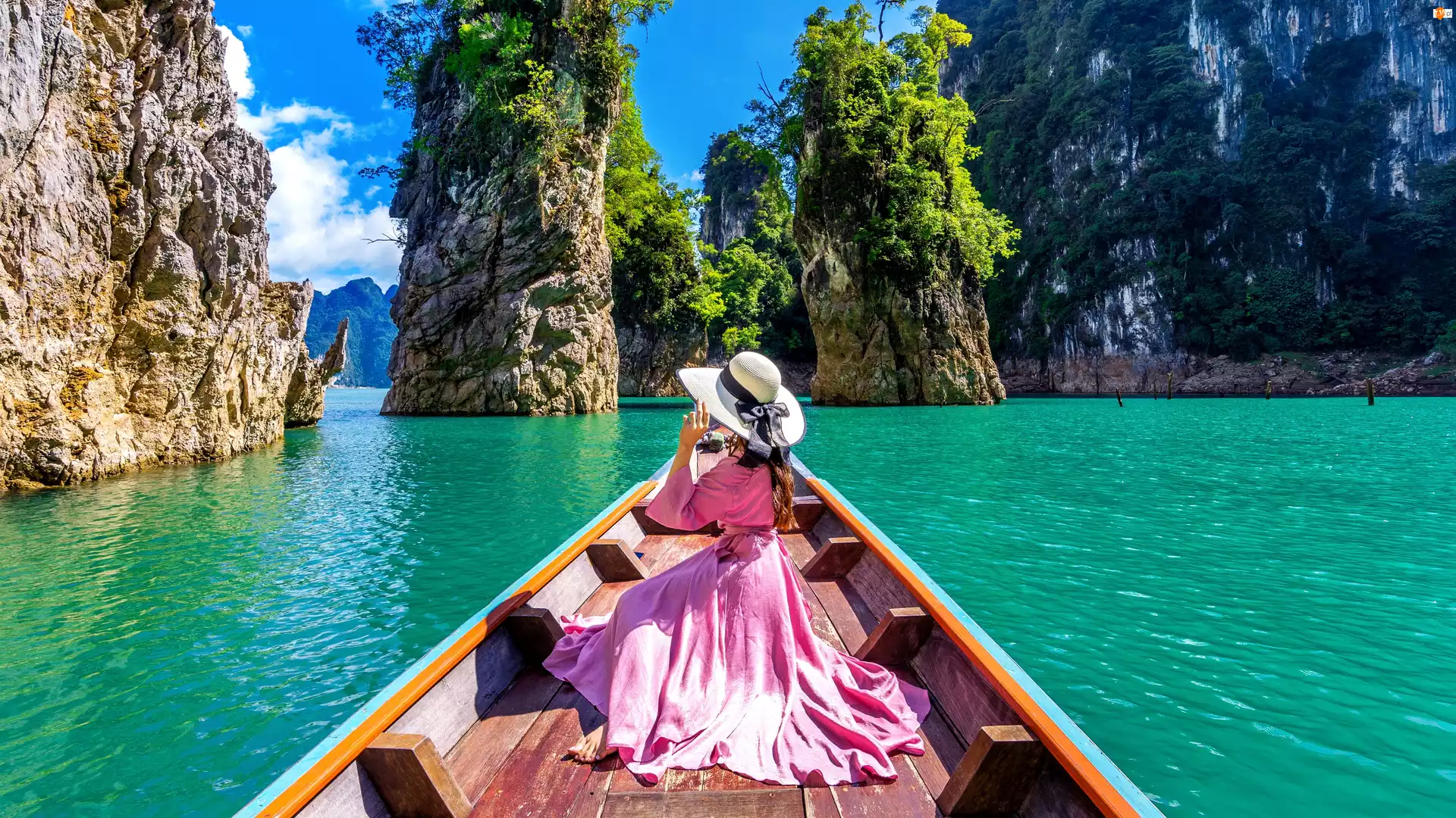Kapelusz, Park Narodowy Khao Sok, Jezioro Ratchaprapha, Drzewa, Różowa, Prowincja Surat Thani, Łódka, Kobieta, Skały, Sukienka, Tajlandia