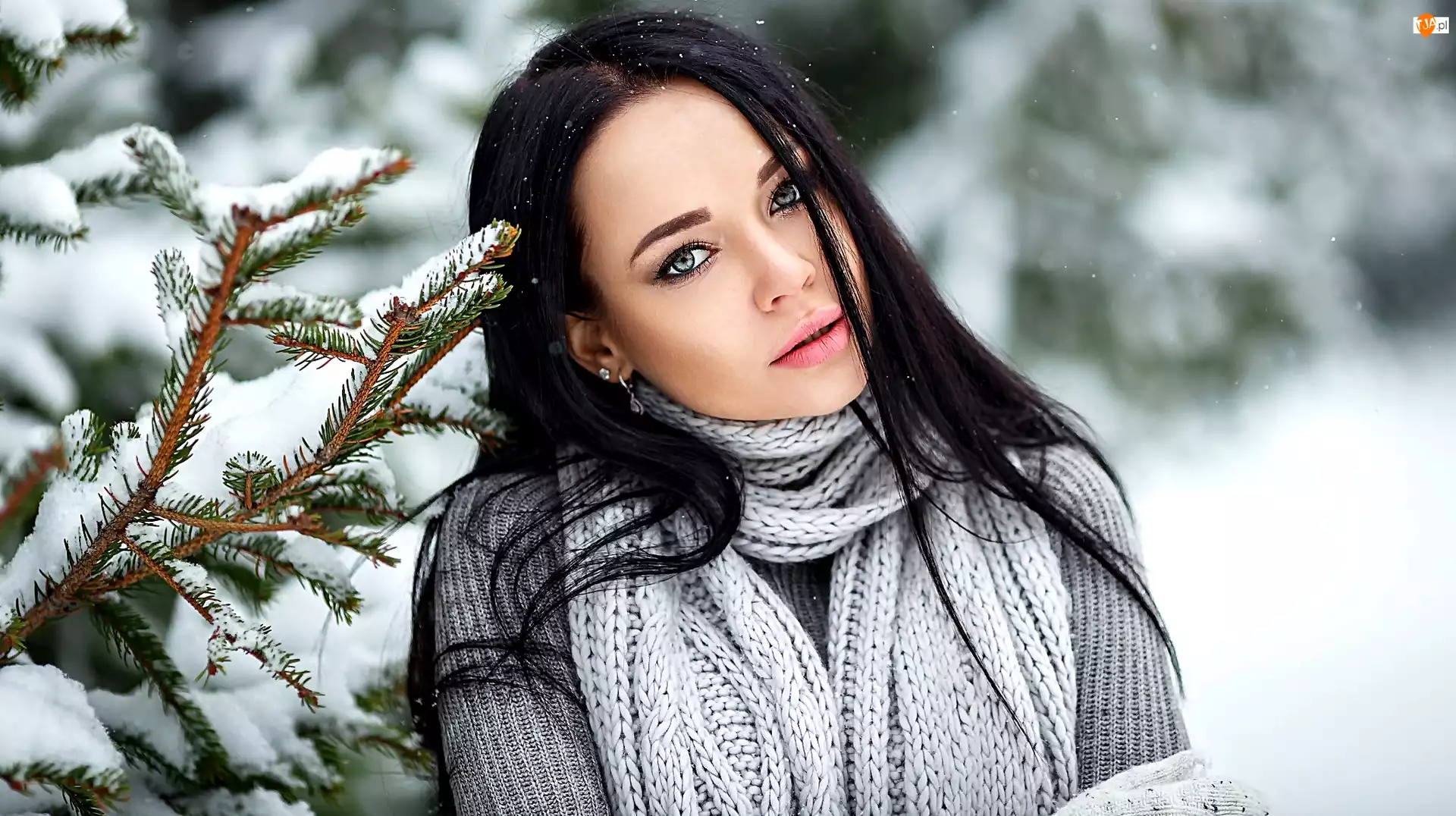 Modelka, Angelina Petrova, Świerk, Kobieta, Gałązka, Śnieg, Szal