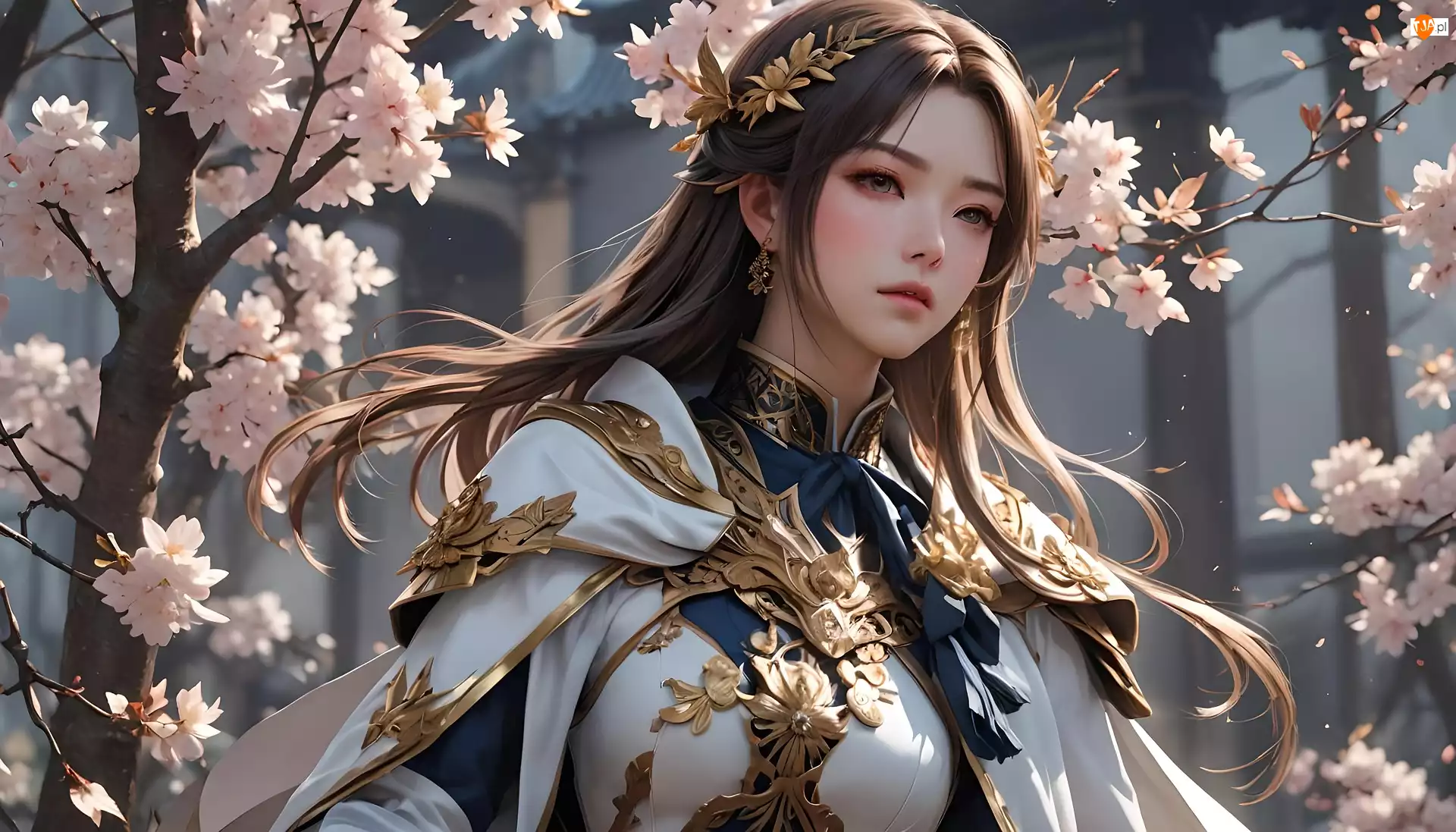 Kobieta w tradycyjnym stroju pod kwitnącymdrzewem