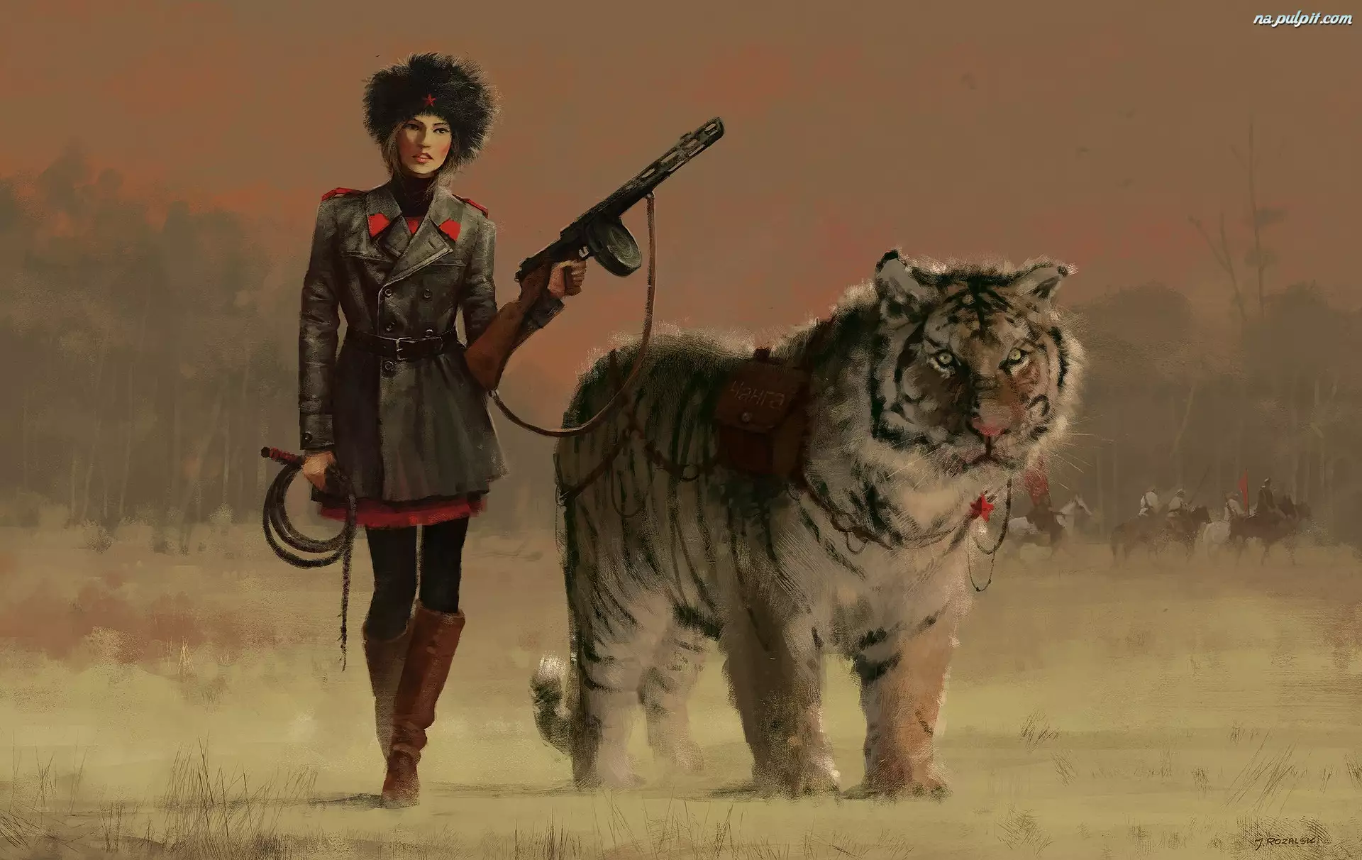 Pistolet maszynowy PPSz, Digital Art, Broń, Kobieta, Tygrys