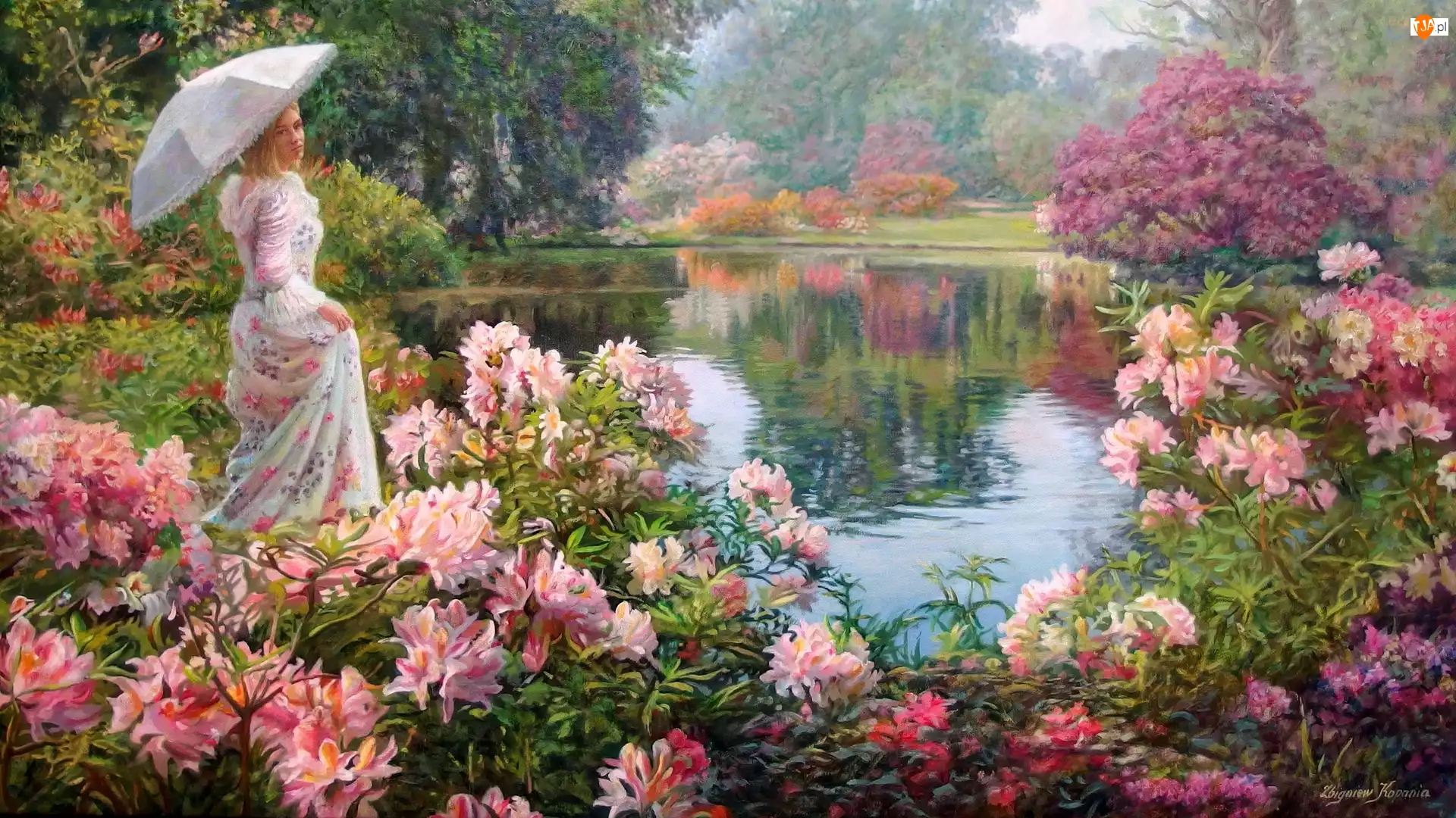 Jezioro, Obraz, Kwiaty, Parasolka, Park, Zbigniew Kopania, Kobieta, Malarstwo, Sukienka