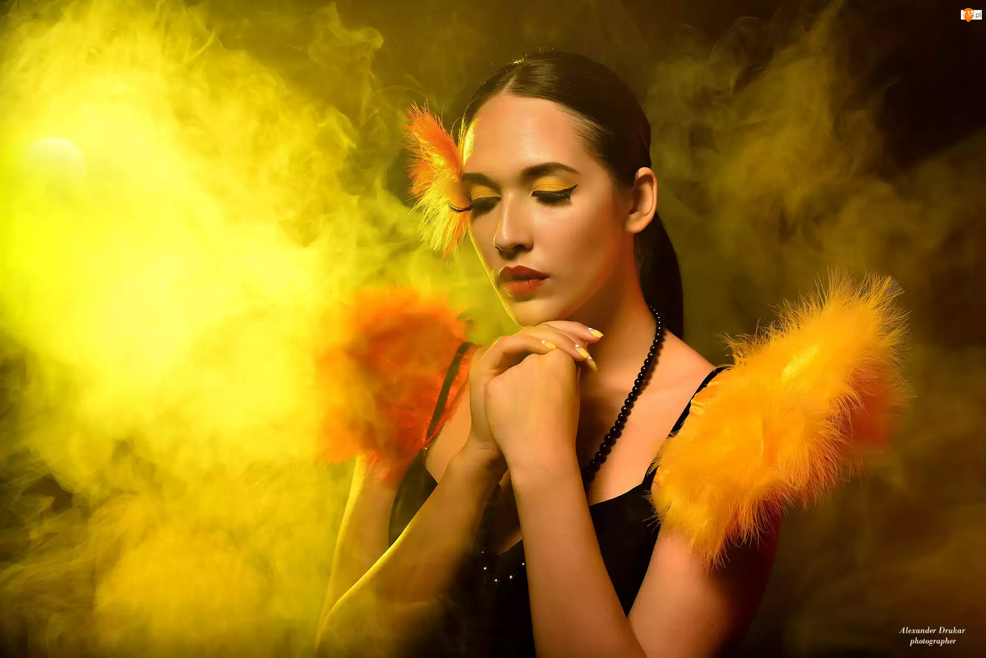Makijaż, Dym, Pióra, Kobieta, Korale