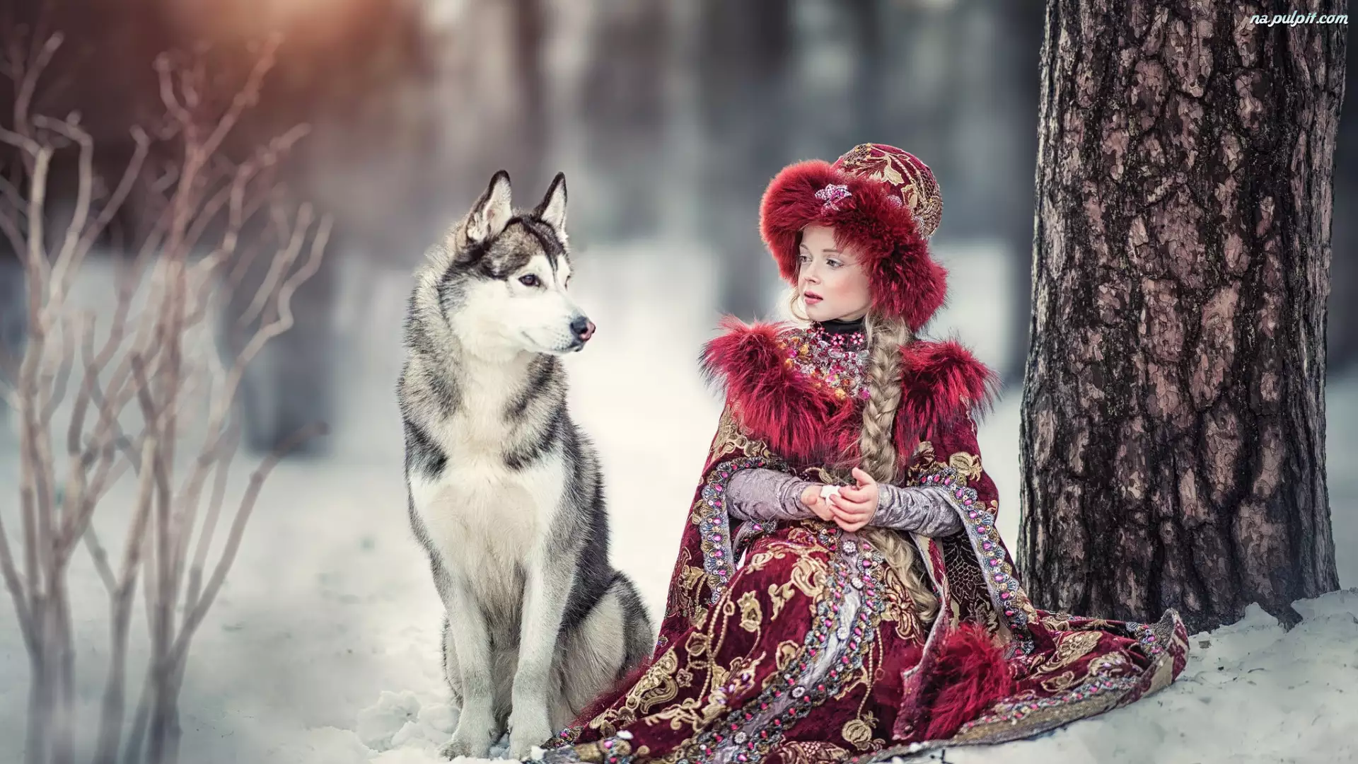 Zima, Siberian husky, Dziewczynka, Pies, Drzewo