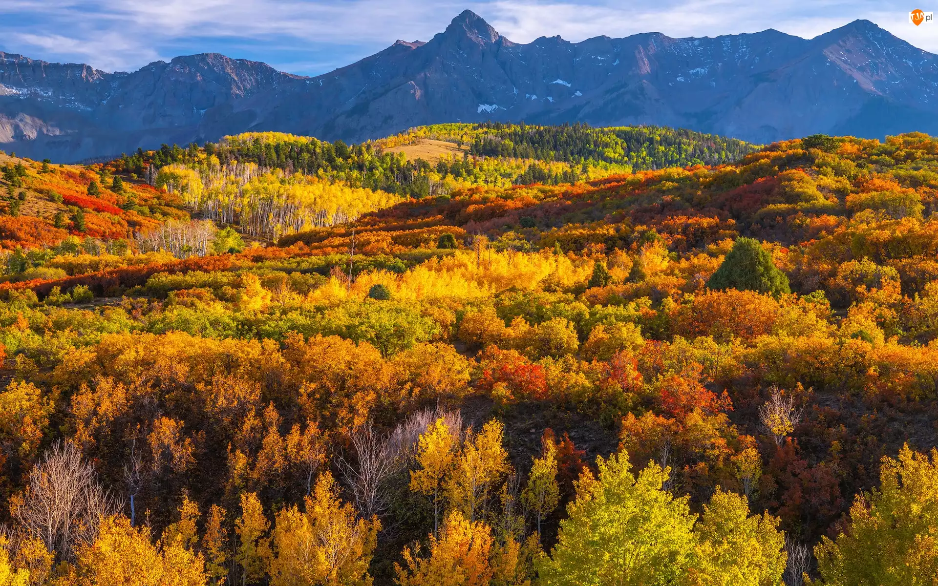 Stany Zjednoczone, Góry, Kolorado, Lasy, Drzewa, San Juan Mountains, Przełęcz, Jesień, Dallas Divide