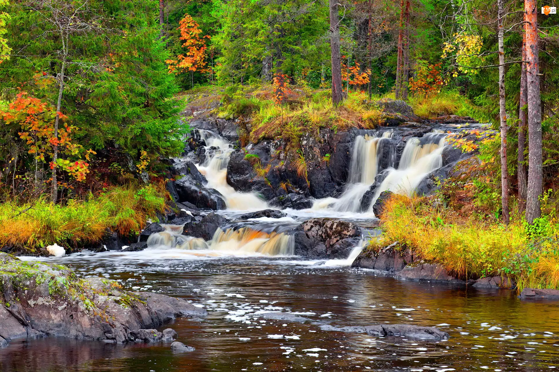 Jesień, Drzewa, Wodospad, Rzeka, Kamienie