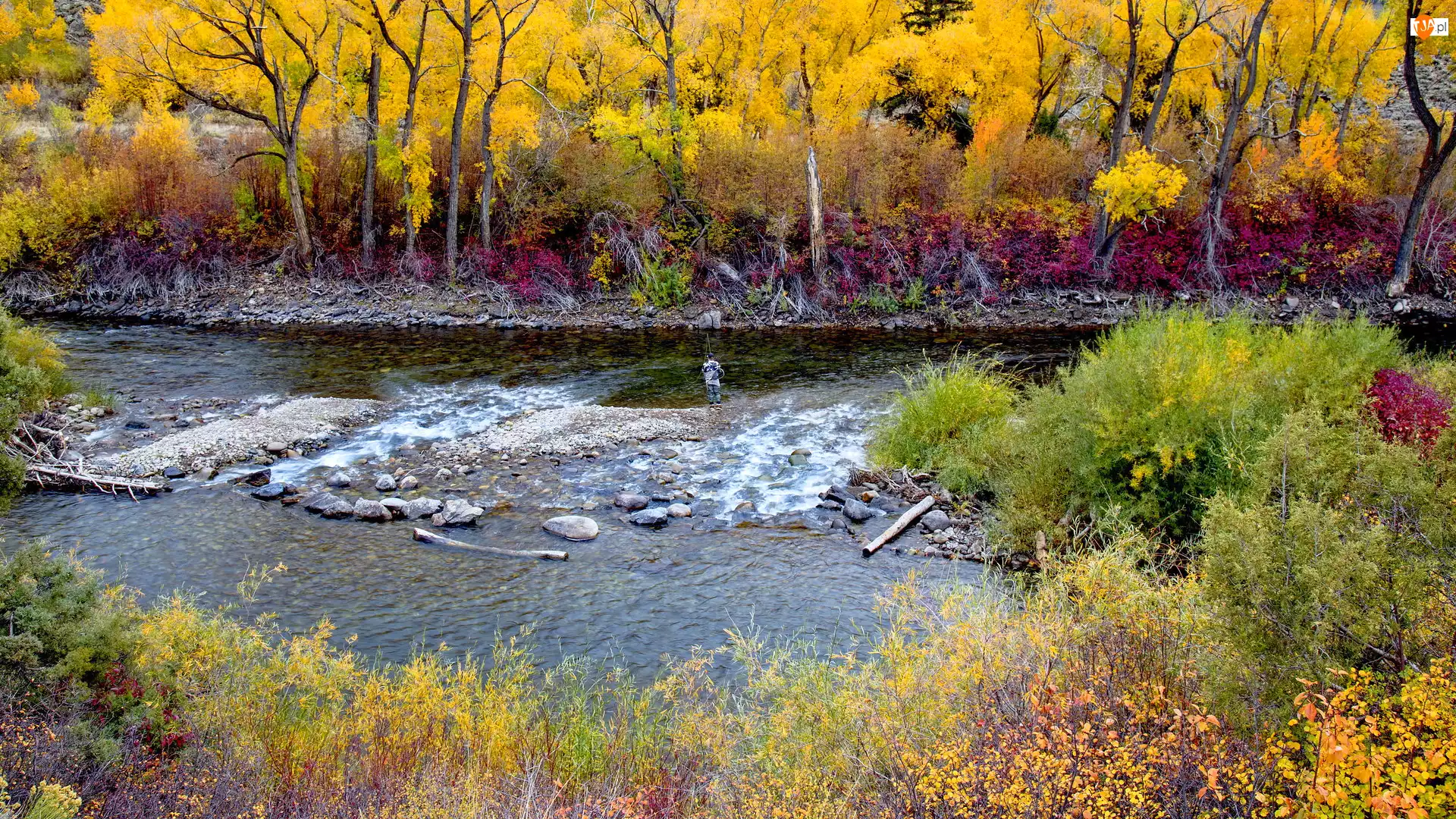 Stany Zjednoczone, Drzewa, Wędkarz, Pożółkłe, Rzeka, Jesień, Kolorowe, Gunnison River, Rośliny, Kolorado