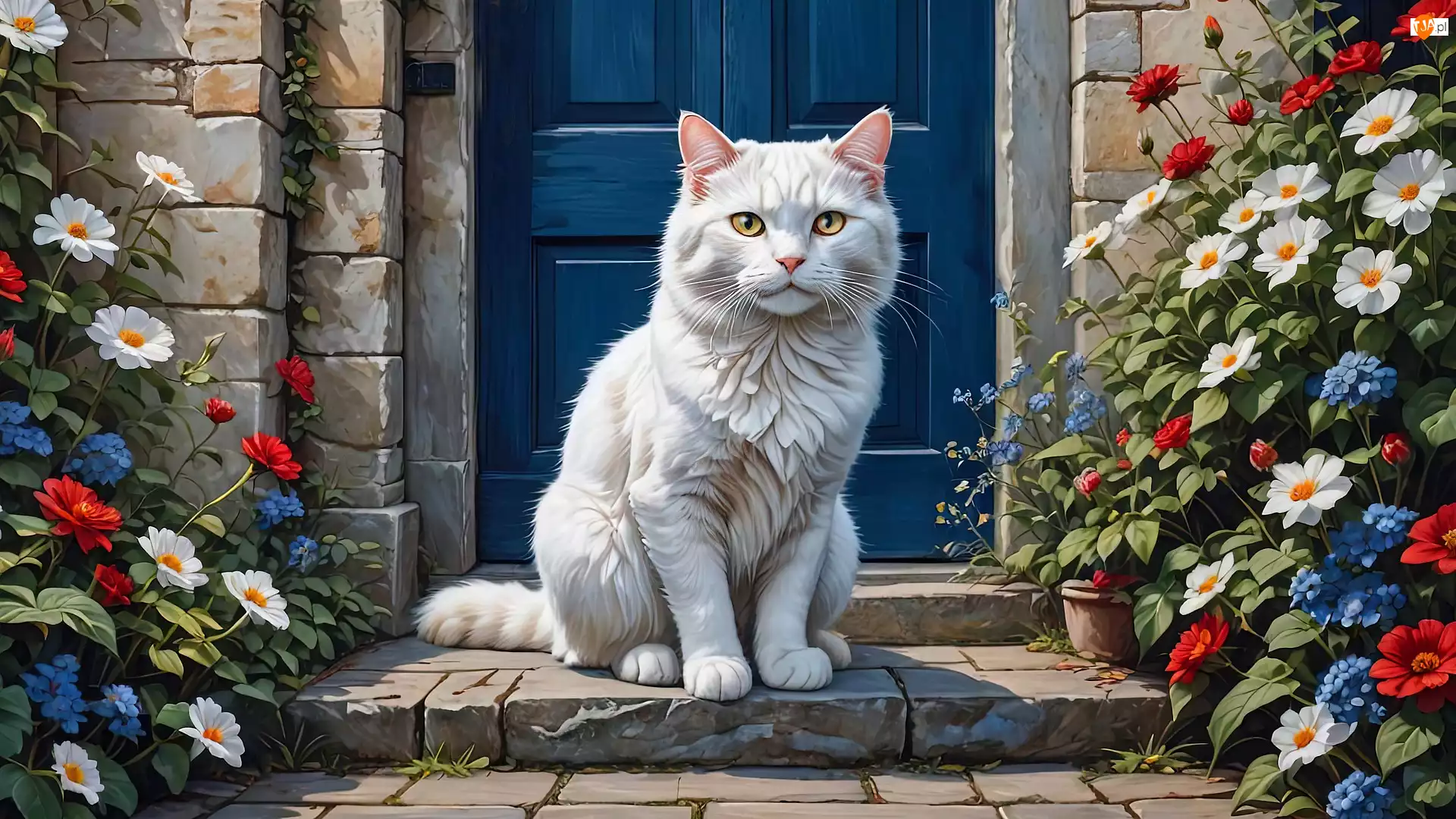 Kot, Biały, Niebieskie, Grafika, Kwiaty, Drzwi