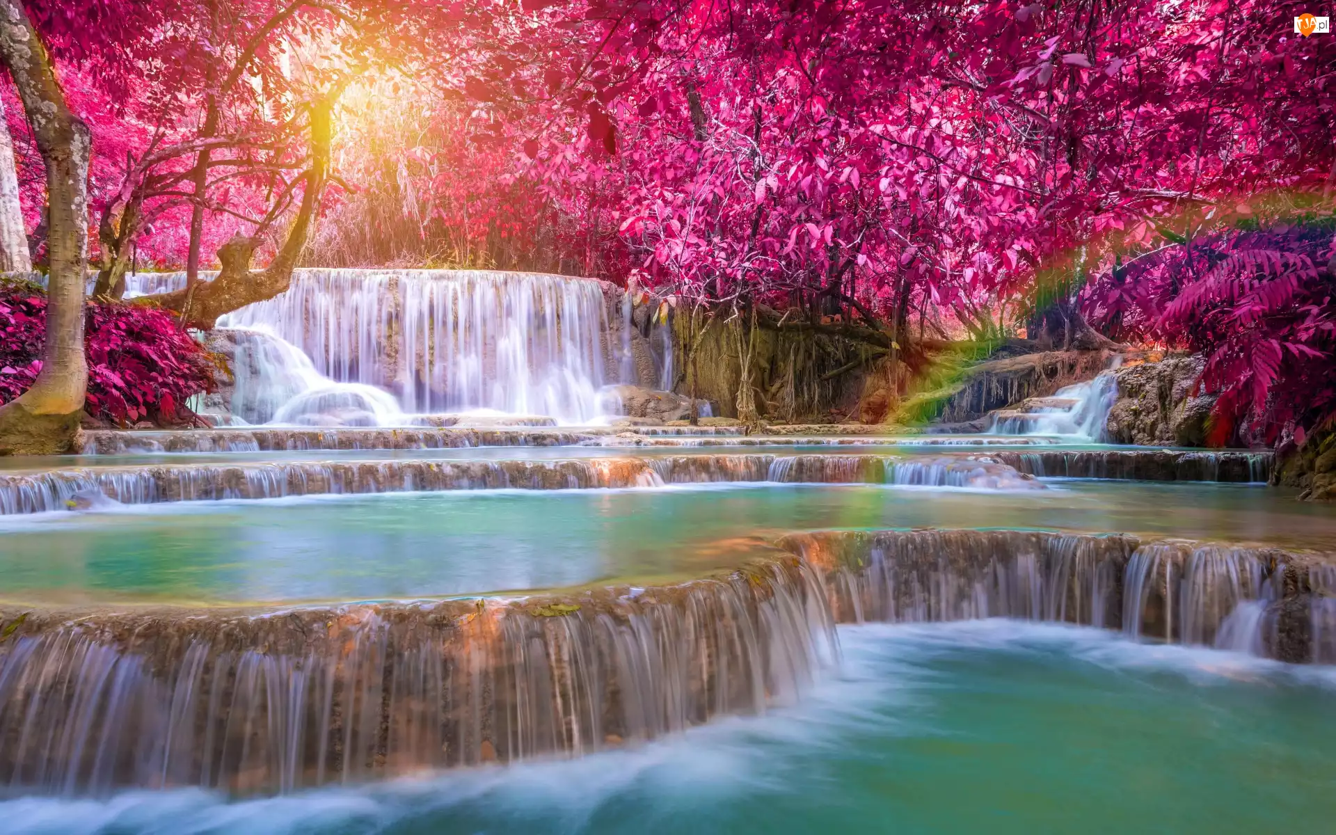 Kolorowe, Laos, Kuang Si Falls, Drzewa, Prowincja