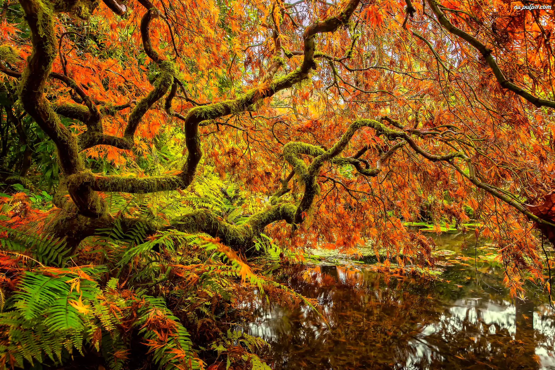 Klon japoński, Liście, Drzewa, Staw, Jesień
