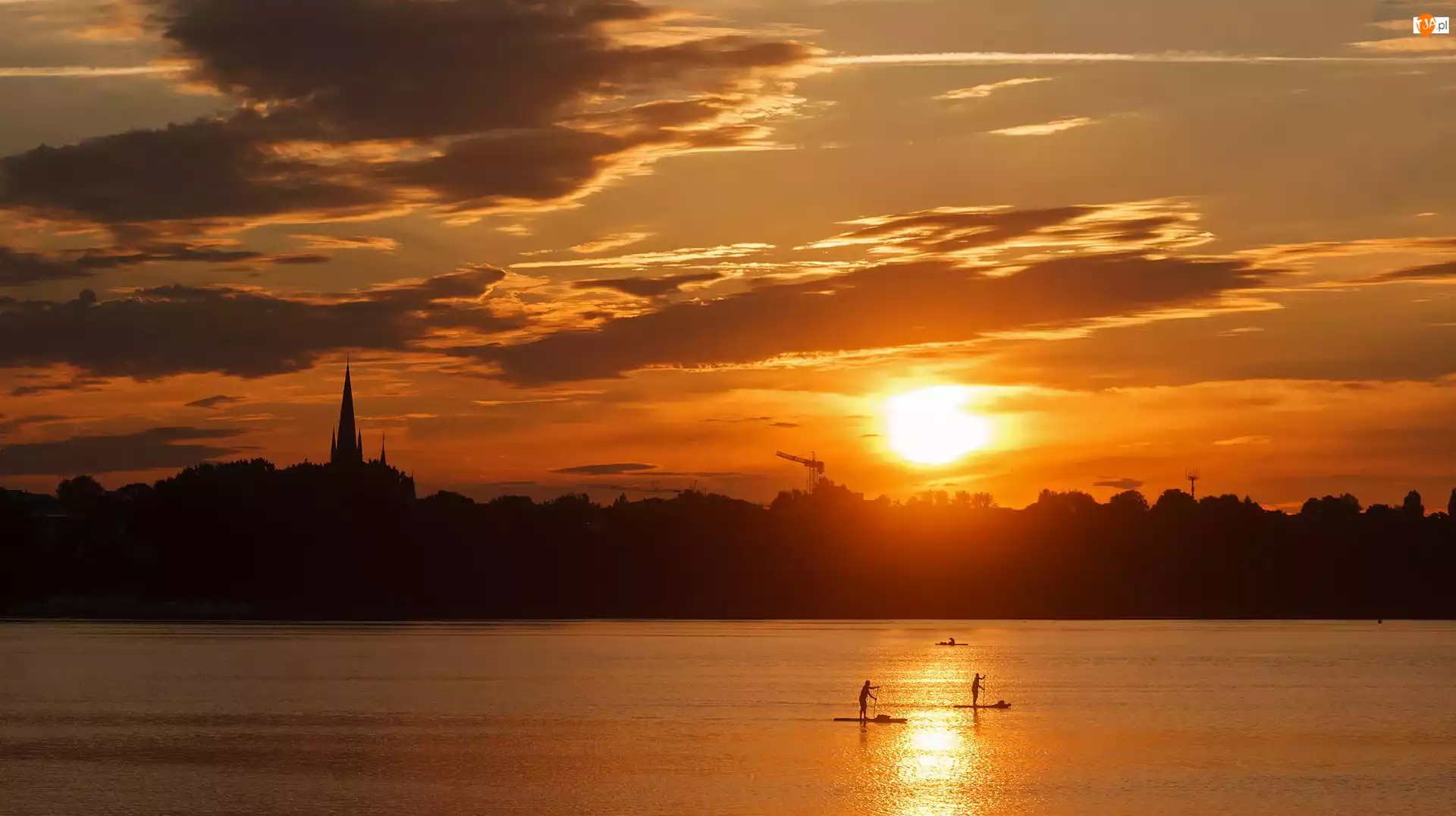 Wieża, Chmury, Zachód słońca, Rzeka, Kościół