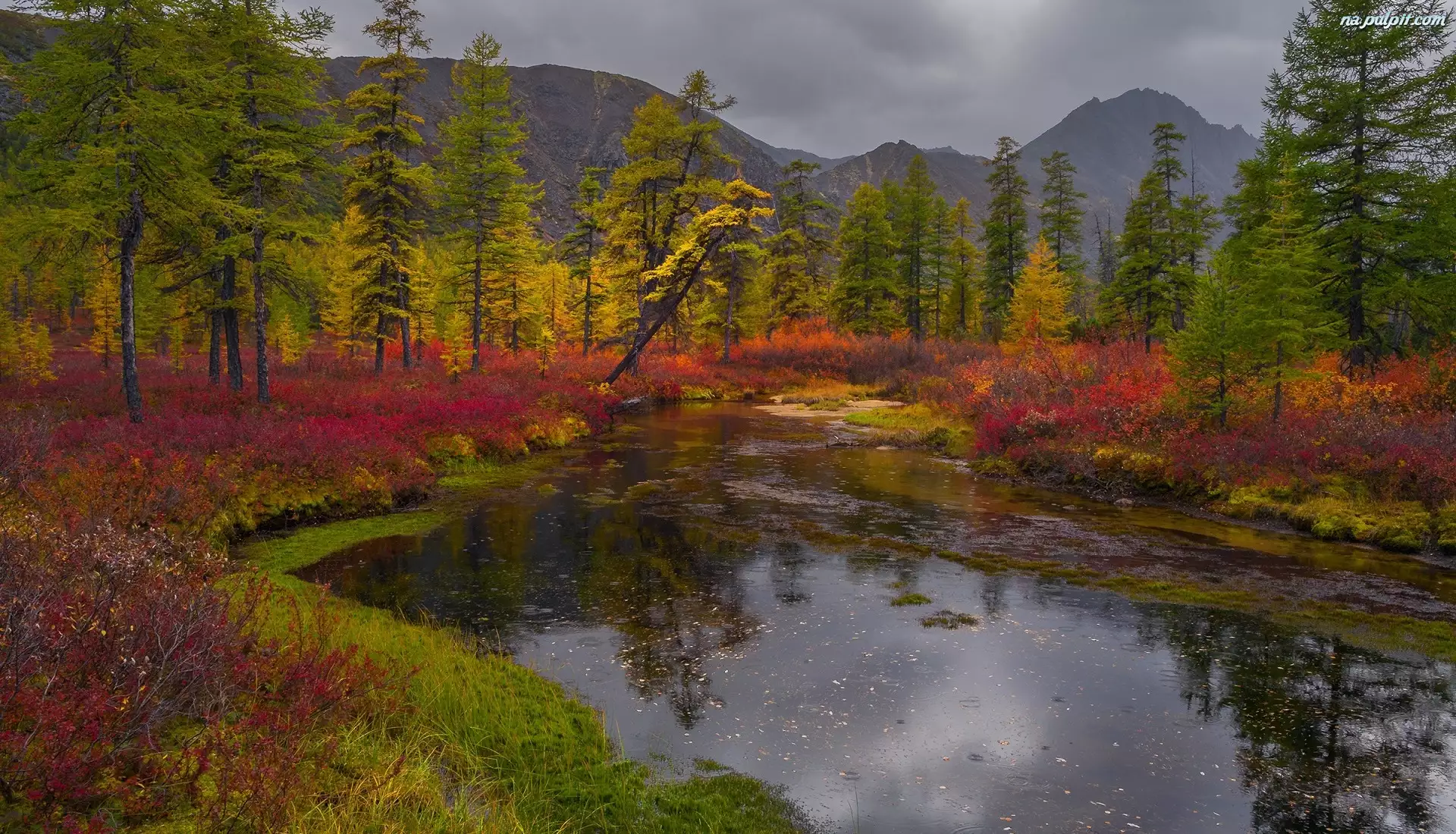 Kołyma, Jesień, Drzewa, Obwód magadański, Jezioro Jack London, Rośliny, Rosja, Góry Kołymskie
