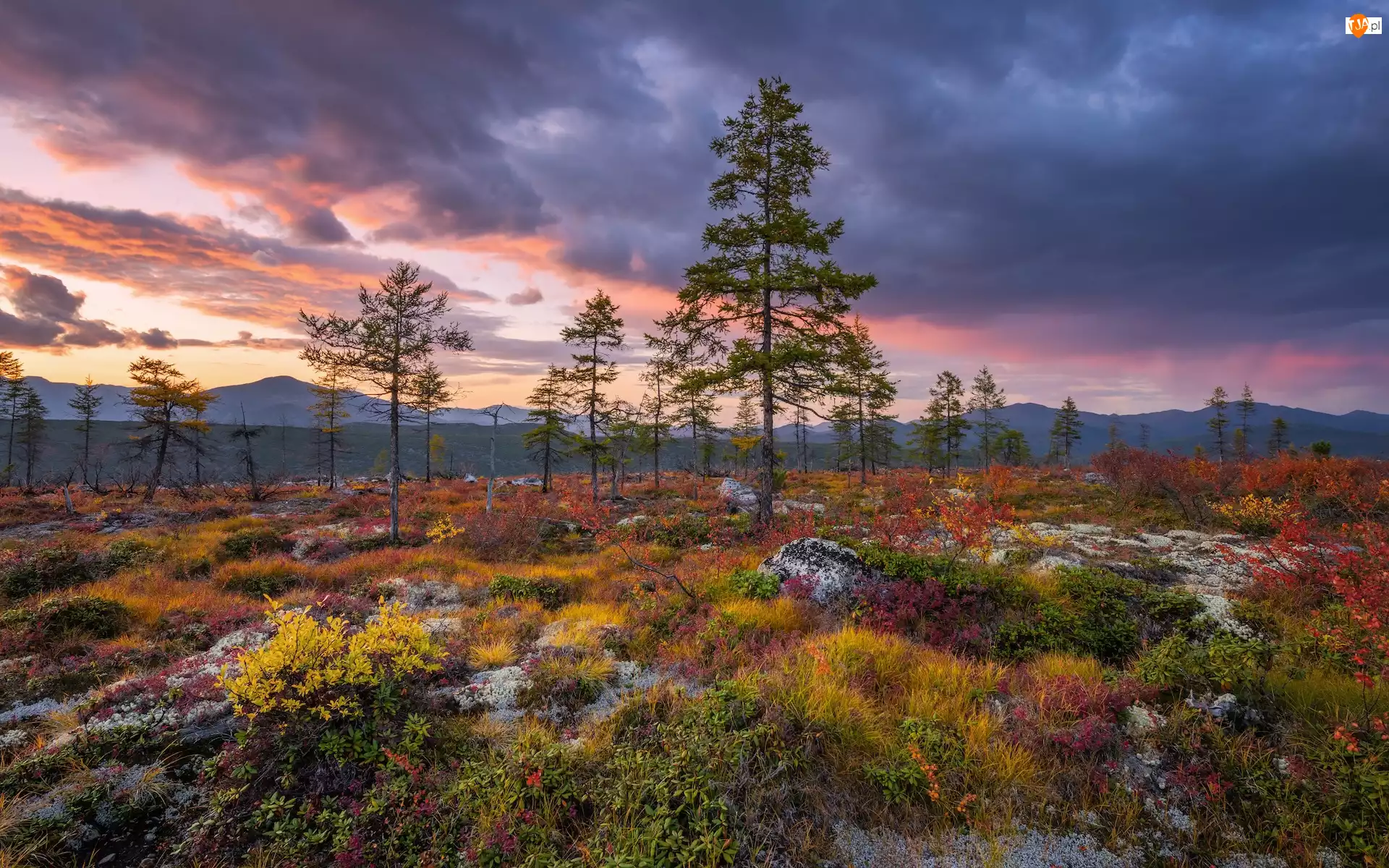 Kołyma, Jesień, Zachód słońca, Rosja, Góry, Roślinność, Drzewa