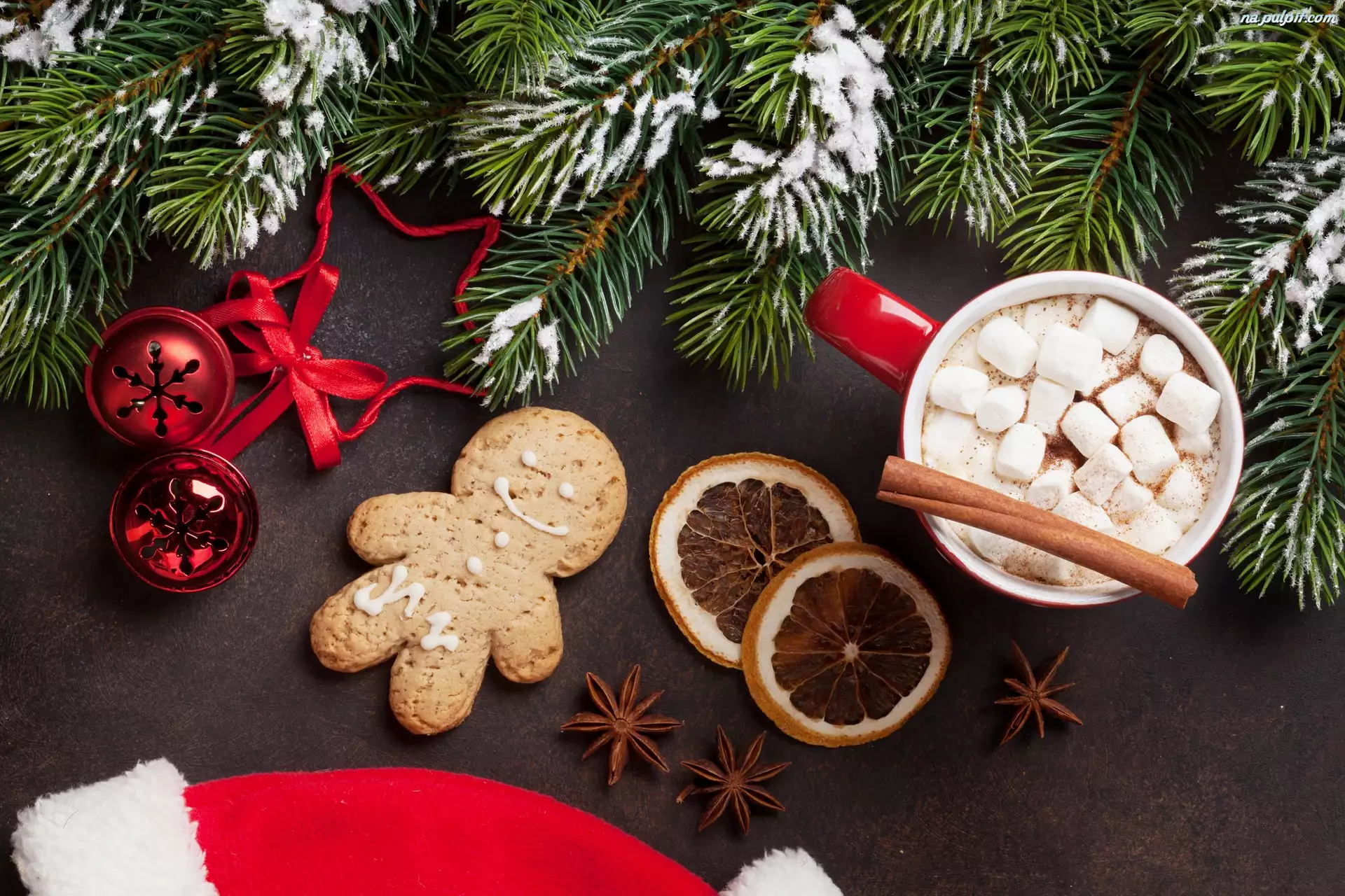 Świerk, Anyż, Kakao, Gałązki, Kompozycja, Boże Narodzenie, Kubek, Świąteczna, Laska cynamonu, Pierniczek, Pianki
